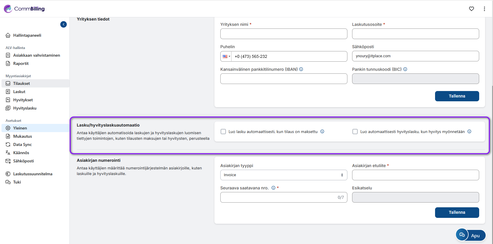 - Vaihe 1: Siirry CommBillingin Asetukset-välilehdelle.