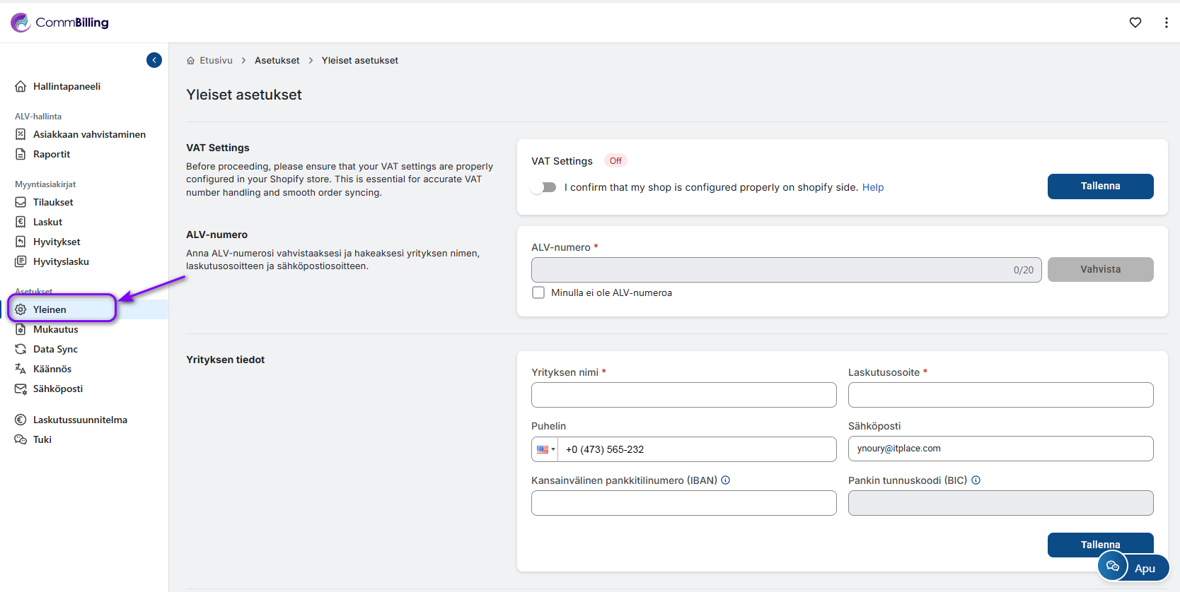- Vaihe 1: Siirry CommBillingin "Asetukset"-välilehdelle.