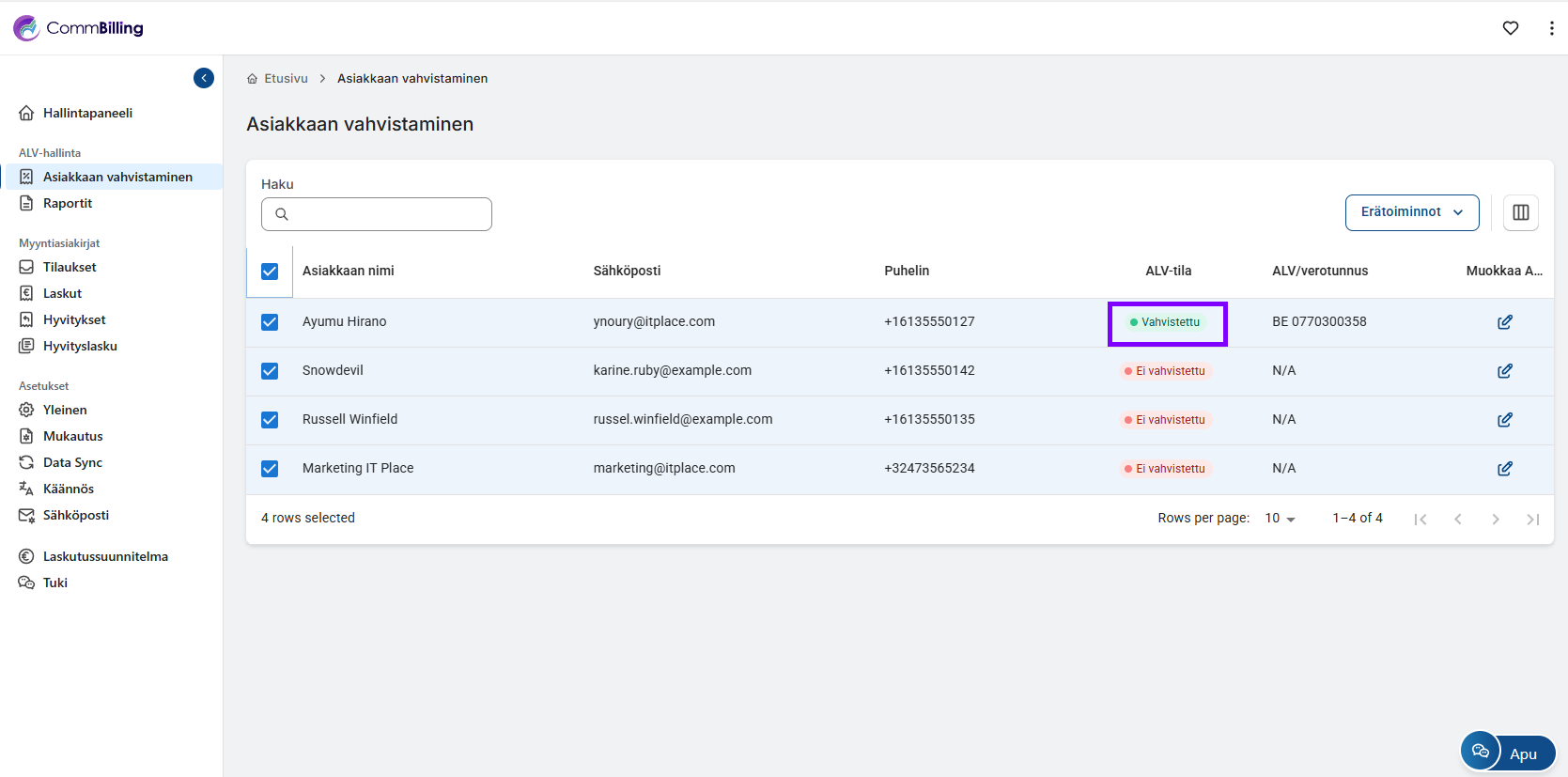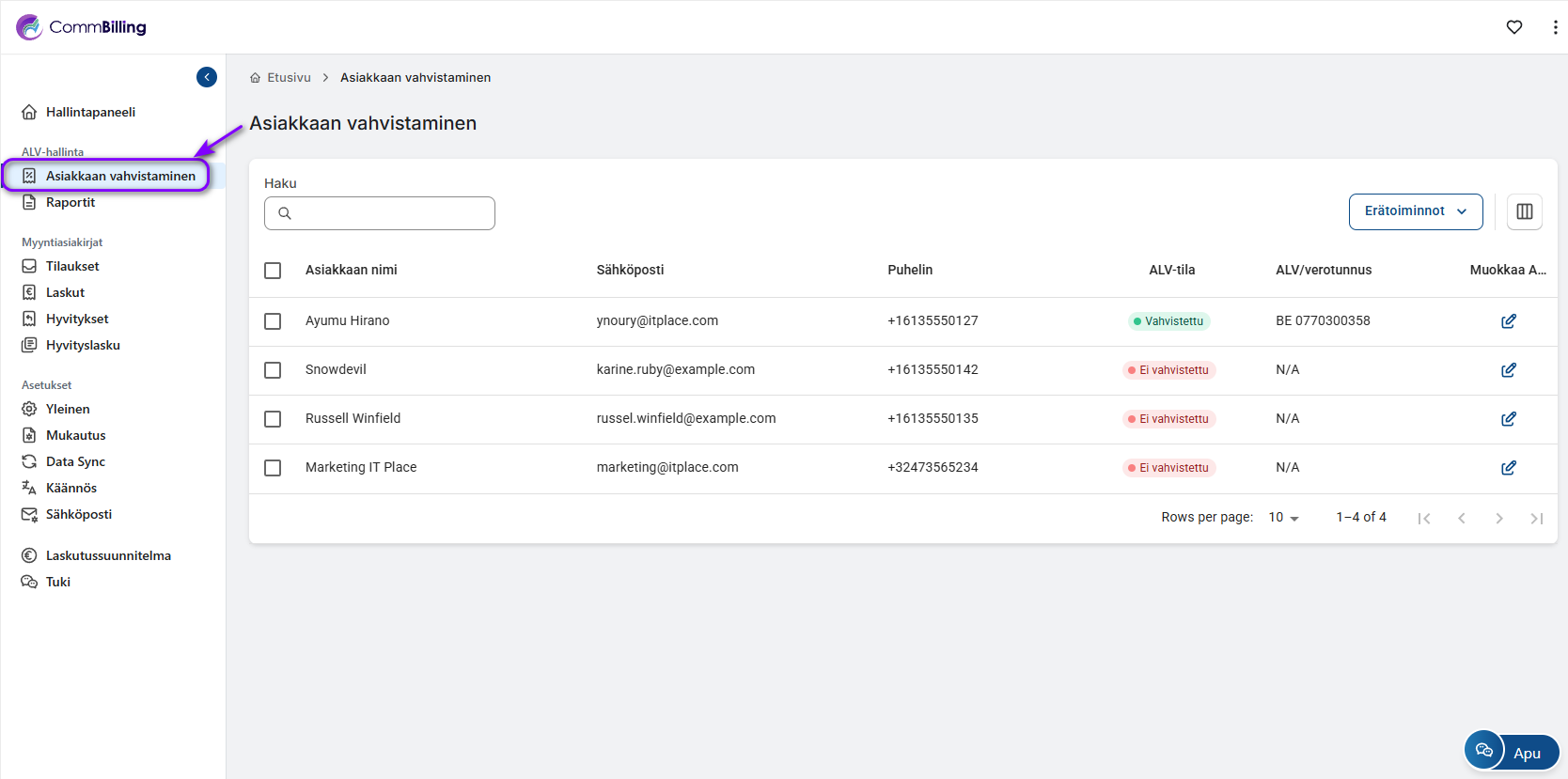 Noudattamalla näitä ohjeita voit helposti validoida ja ottaa eurooppalaiset ALV-numerot käyttöön asiakkaillesi CommBillingissä. Tämä varmistaa, että laskuissa ja muissa verotukseen liittyvissä prosesseissa käytetään oikeita ALV-asetuksia.