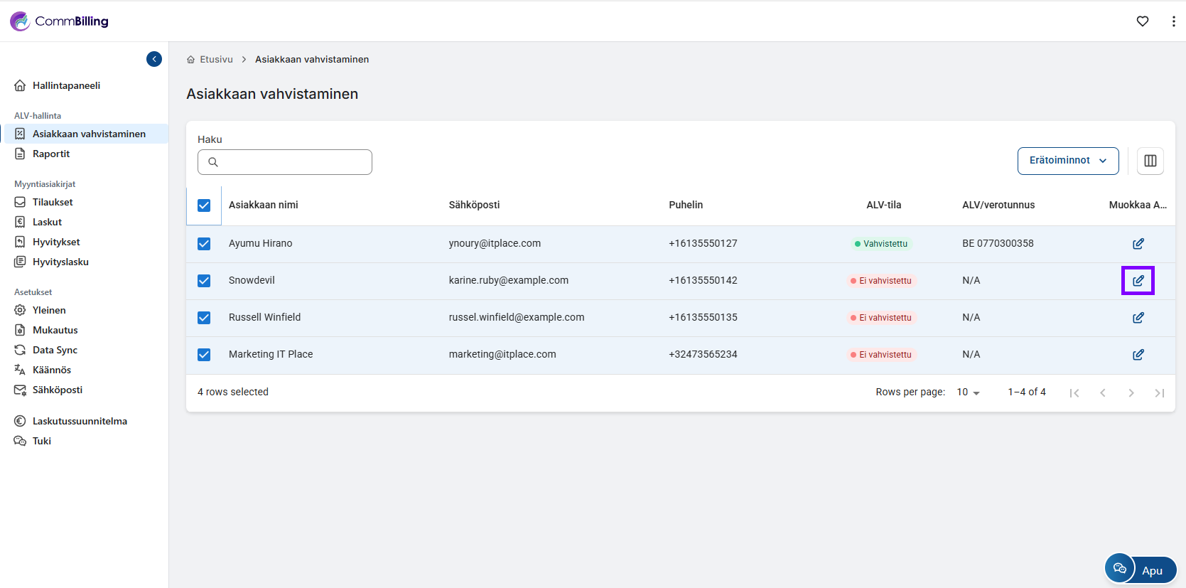 2. Etsi asiakas, jolle haluat lisätä tai validoida ALV-numeron. Napsauta lyijykynää (muokkauskuvaketta) asiakkaan ALV-kentän vieressä.
