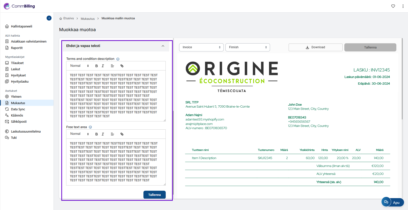 Mukautettujen huomautusten tai ehtojen lisääminen tekee laskuistasi informatiivisempia ja ammattimaisempia samalla kun säilytät avoimuuden asiakkaille. CommBillingin avulla voit helposti mukauttaa nämä osiot jotta yrityksesi voi välittää tärkeät tiedot selkeästi ja johdonmukaisesti jokaisessa asiakirjassa.