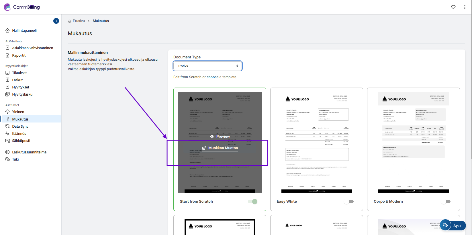 Maksuohjeiden mukauttaminen antaa sinulle mahdollisuuden viestiä selkeästi, miten asiakkaiden tulee suorittaa maksunsa, samalla kun se heijastaa yrityksesi mieluisia ehtoja ja ammattimaisuutta. CommBillingissä voit helposti muokata laskujesi maksuohjeet-osiota lisätäksesi pankkitiedot, maksuehdot tai erityiset huomautukset, jotka helpottavat sujuvia maksutapahtumia.