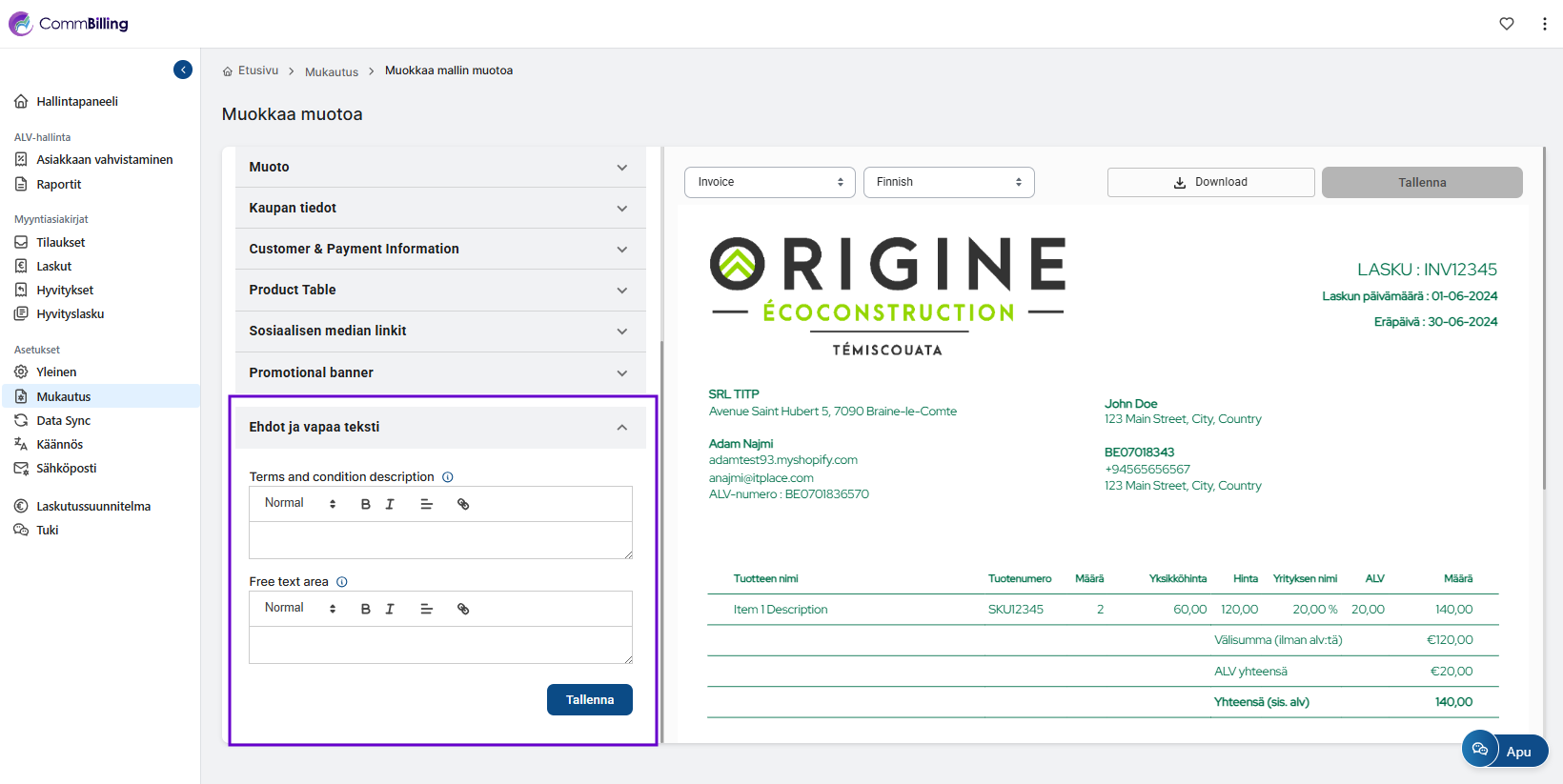 - Vaihe 5: Syötä omat ohjeesi, kuten pankkitiedot, maksun määräajat, hyväksytyt maksutavat tai lisäehdot. Tarkastele muutoksia reaaliajassa laskumallissa varmistaaksesi, että päivitetty sisältö on oikein, ja paina sitten Tallenna.