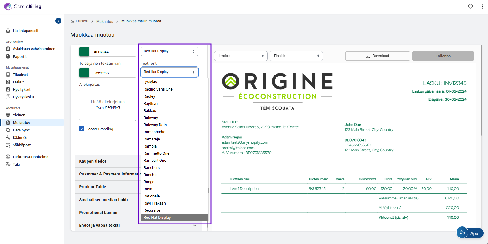 Laskujen fonttien mukauttaminen auttaa sinua ylläpitämään brändisi johdonmukaisuutta ja varmistamaan, että jokainen lähettämäsi asiakirja heijastaa yrityksesi visuaalista identiteettiä. CommBillingissä voit helposti säätää laskuissa käytettävää fonttityyliä niin, että se vastaa yrityksesi tyyliä ja suunnitteluprefenssejä, mikä luo ammattimaisemman ja henkilökohtaisemman ulkoasun.