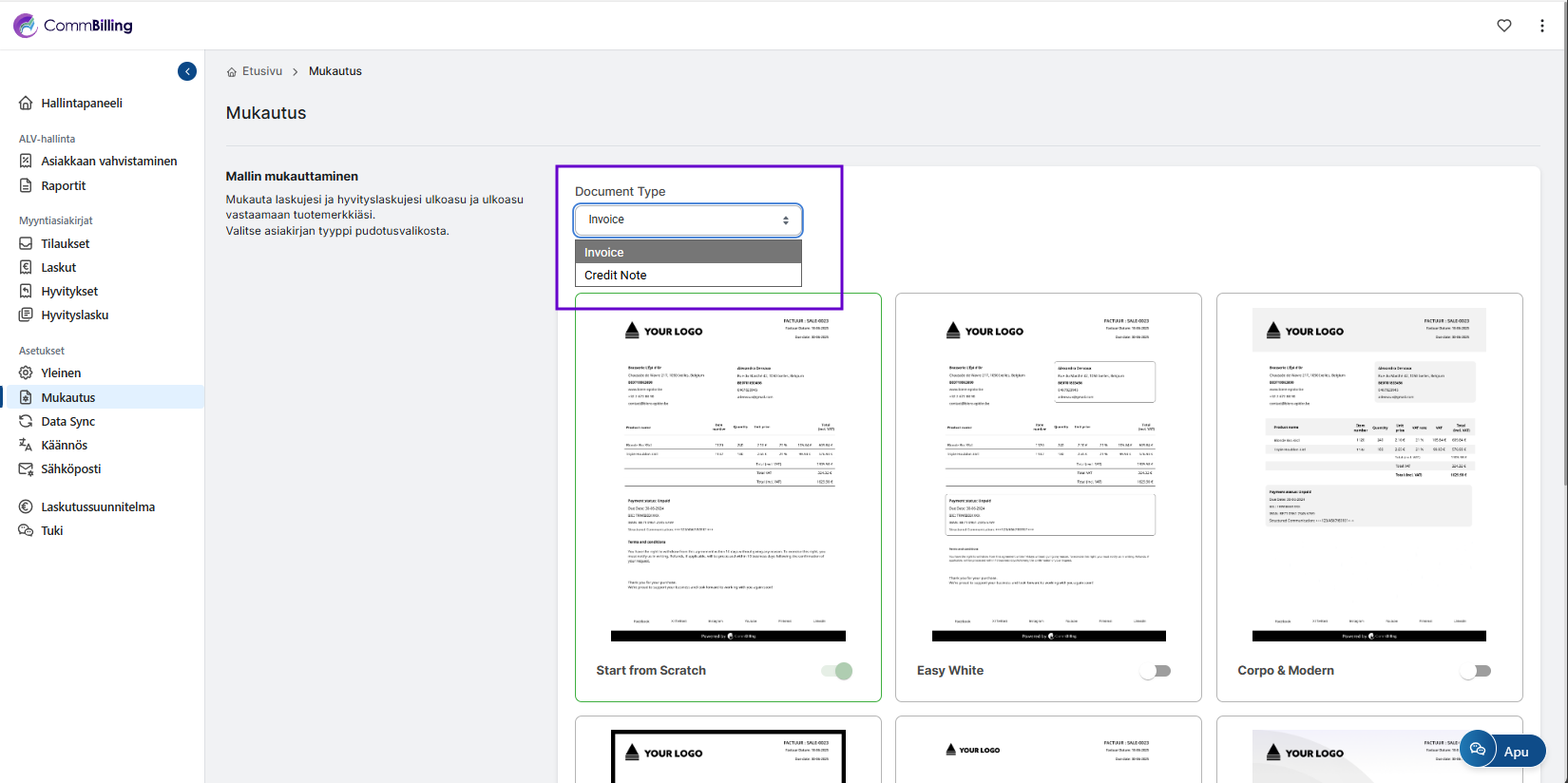 CommBilling tarjoaa valikoiman ennalta määritettyjä laskupohjia, jotka on suunniteltu ammattimaisilla ja yritysorientoituneilla värimalleilla ja jotka noudattavat moderneja brändäysstandardeja. Jokainen pohja on rakennettu antamaan laskuillesi viimeistelty ja yhdenmukainen ulkoasu. Voit kuitenkin silti personoida valitun pohjan muuttamalla sen värejä niin, että se vastaa täydellisesti yrityksesi visuaalista identiteettiä.