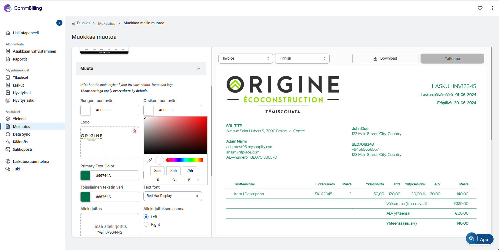 - Otsikoiden väri: Vaihda otsikoiden ja osioiden nimien väriä, kuten ”Laskun päivämäärä” tai ”Yhteensä (sis. ALV)”.