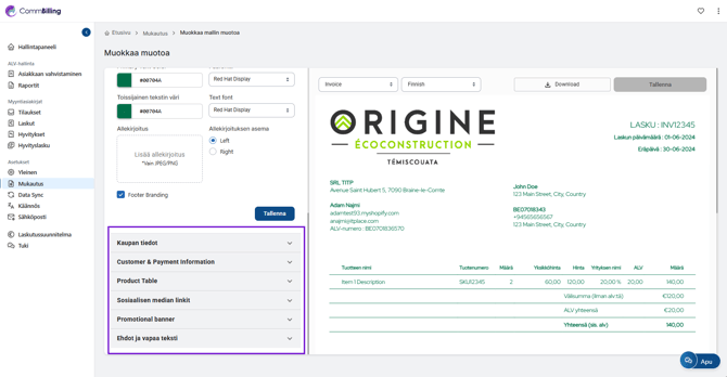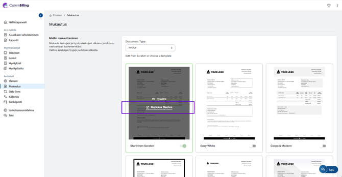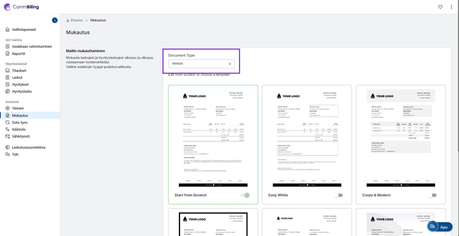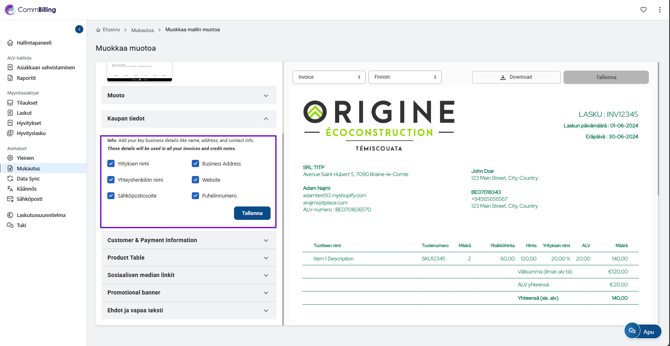 Hallinnoimalla sitä mitkä kentät näkyvät laskuissasi varmistat että asiakirjasi pysyvät olennaisina selkeinä ja ammattimaisina. CommBilling antaa sinulle joustavuutta mukauttaa jokainen lasku yrityksesi tarpeiden mukaan samalla kun säilytät yhtenäisen brändi ilmeen kaikessa asiakasviestinnässä.