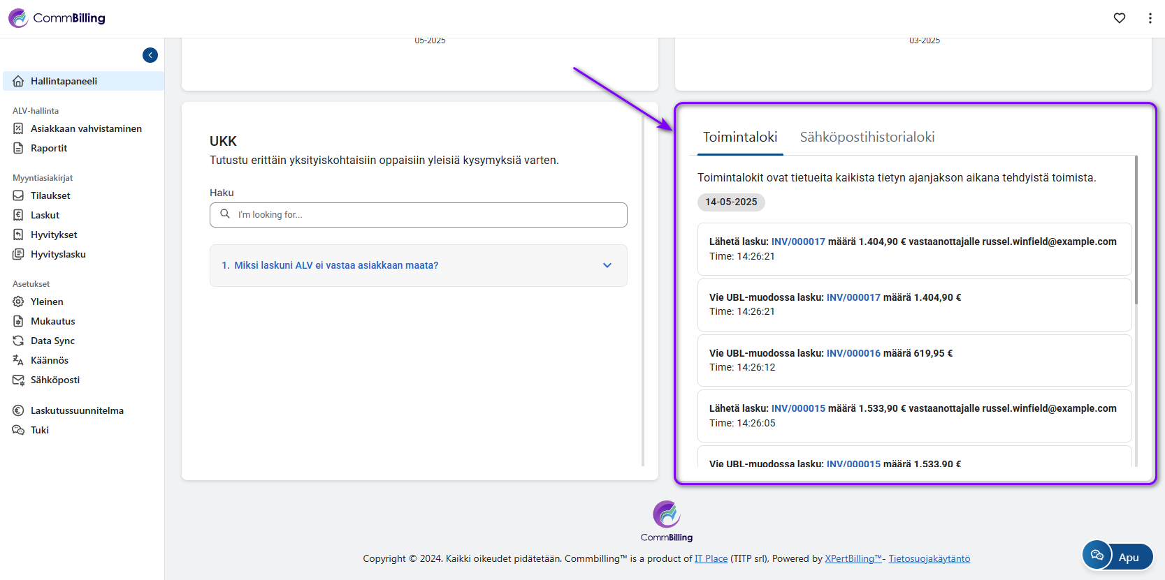 Järjestelmän toiminnan seuranta auttaa varmistamaan läpinäkyvyyden, parantamaan vianmääritystä ja ylläpitämään toiminnan tehokkuutta. CommBillingin Toimintaloki tallentaa kaikki keskeiset toiminnot, jolloin voit seurata muutoksia, asiakirjapäivityksiä ja käyttäjien toimintaa.