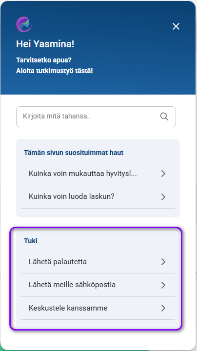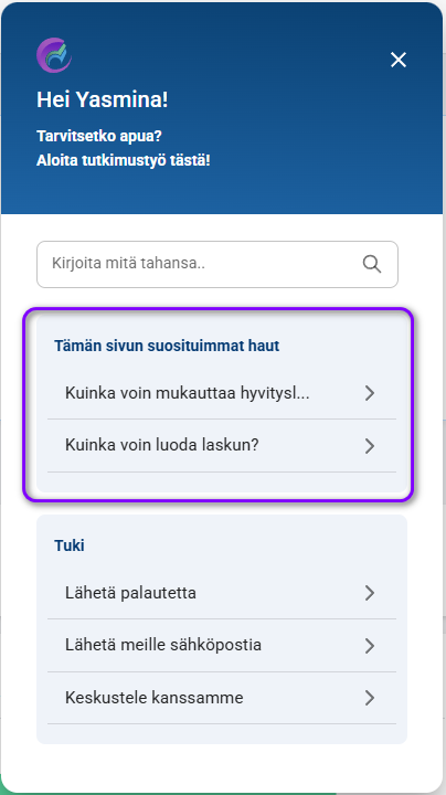 Ohjeosion yläosassa on Hakupalkki. Tähän voit kirjoittaa avainsanoja tai lauseita löytääksesi nopeasti artikkeleita, jotka tarjoavat ohjeita tiettyihin aiheisiin. Tarvitsetpa apua arvonlisäveron asettamisessa, laskujen luomisessa tai mallien mukauttamisessa, hakutoiminto tekee tarvitsemasi tiedon löytämisestä helppoa ilman, että sinun tarvitsee selata useita resursseja.