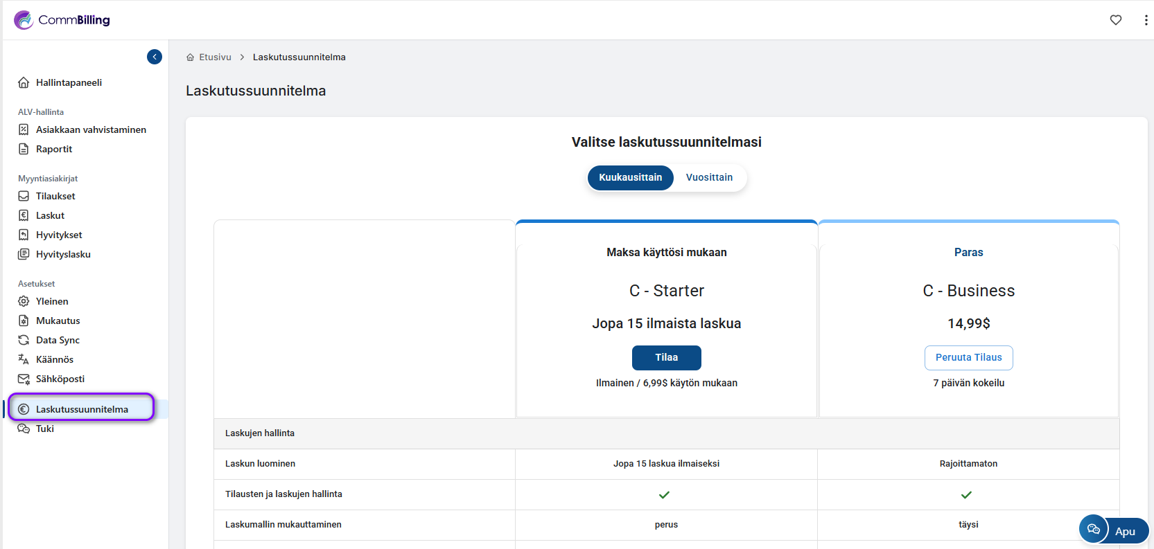Jos tilaat C-Business-suunnitelman uudelleen, ilmainen kokeilujakso ei ole enää käytettävissä, ja veloitukset alkavat välittömästi tilauksen yhteydessä.