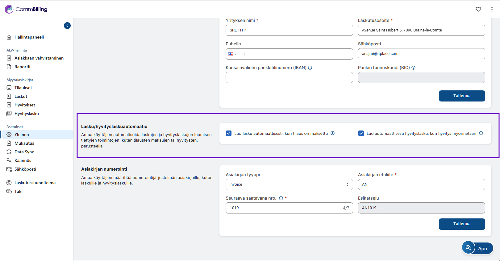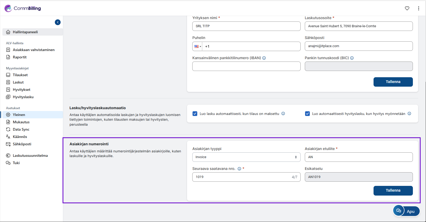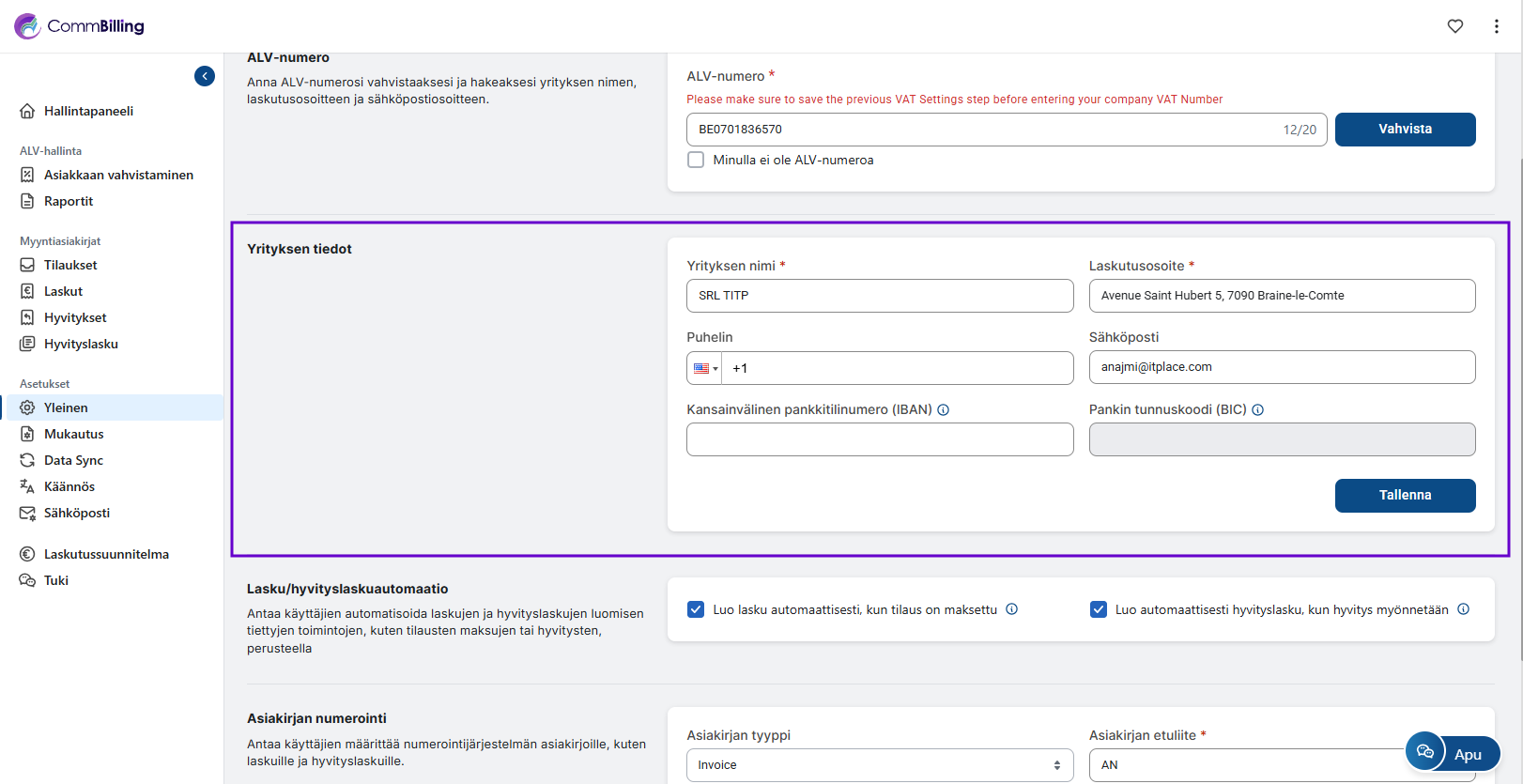 Yleiset asetukset osio on CommBilling asetustesi perusta. Se varmistaa että yrityksesi tiedot ALV vahvistus asiakirjojen numerointi ja automaatiosäännöt on määritetty oikein ennen kuin alat luoda laskuja tai hyvityslaskuja. Tämän osion oikea määritys takaa tarkkuuden vaatimustenmukaisuuden ja sujuvan päivittäisen toiminnan.