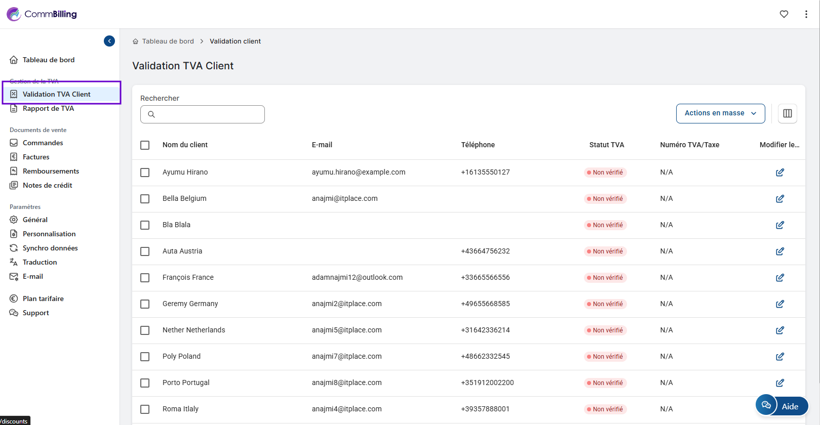 Cette section est conçue pour simplifier la gestion des informations TVA de vos clients. Vous pouvez ajouter ou modifier manuellement les informations TVA pour chaque client et en un clic CommBilling vérifiera automatiquement le numéro de TVA. Le système confirmera si le numéro est valide vous aidant ainsi à garantir exactitude et conformité.