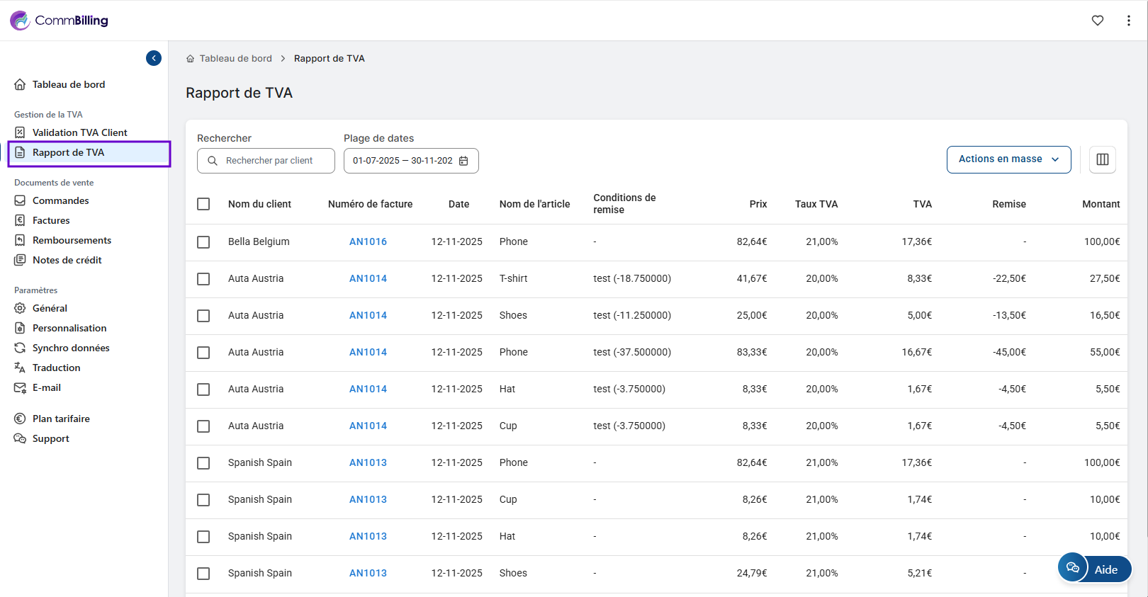L’onglet Gestion de la TVA dans CommBilling est une fonctionnalité exclusive disponible uniquement pour les utilisateurs du plan C Business. Cet onglet sert d’outil complet pour gérer les informations TVA de vos clients et générer des rapports TVA détaillés afin de rester conforme aux réglementations de l’Union européenne.
