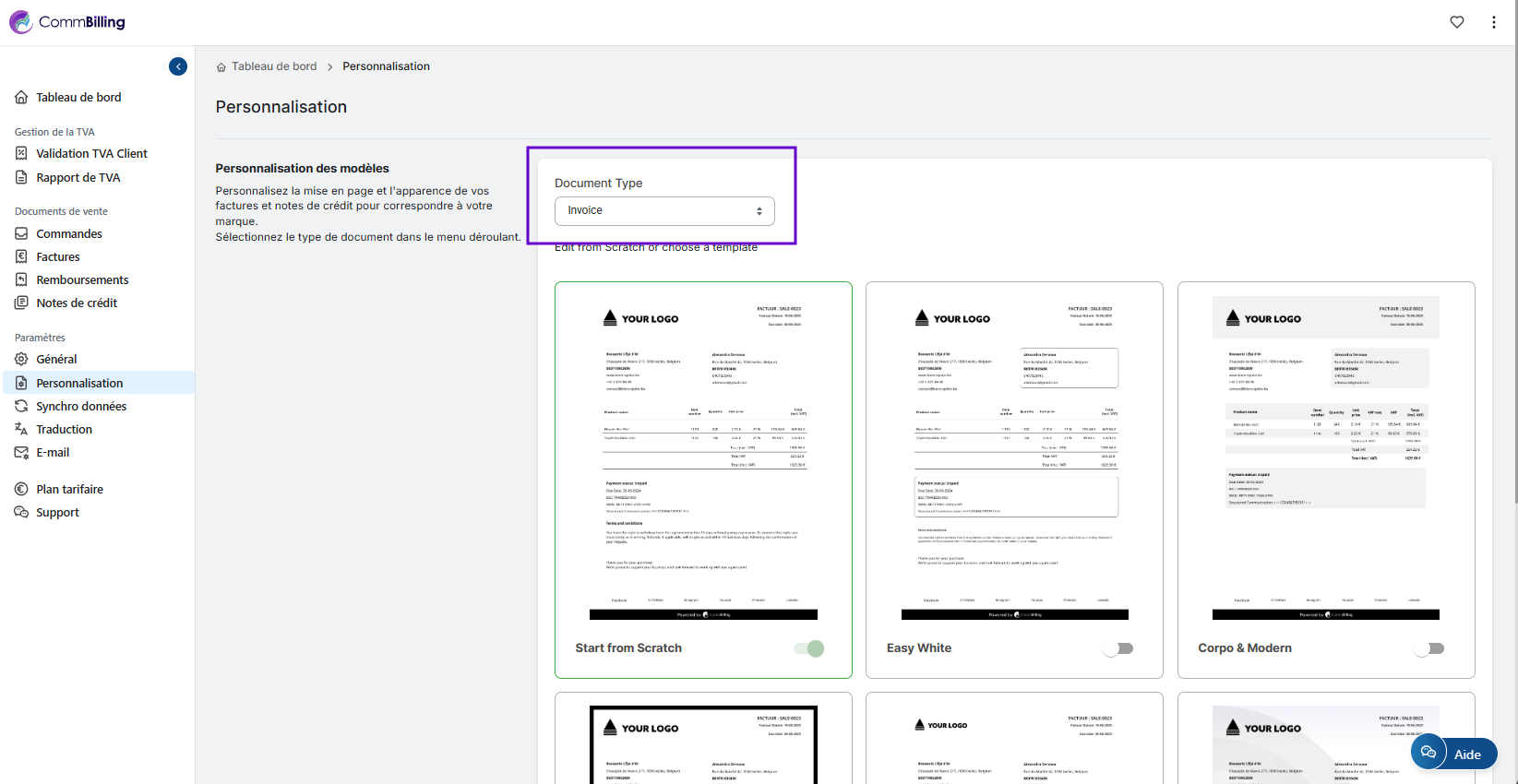 - Étape 2: Choisissez Facture "Invoice" dans Type de document.