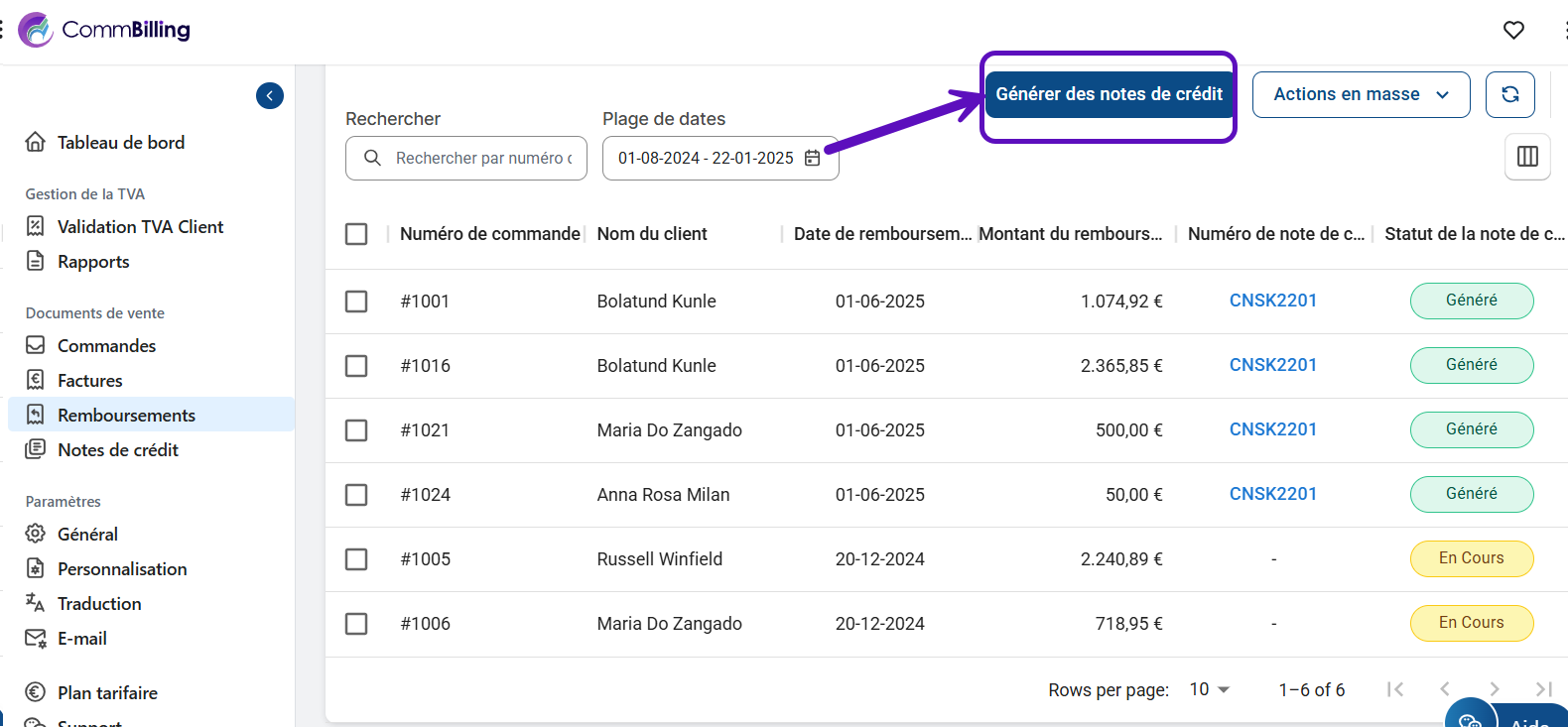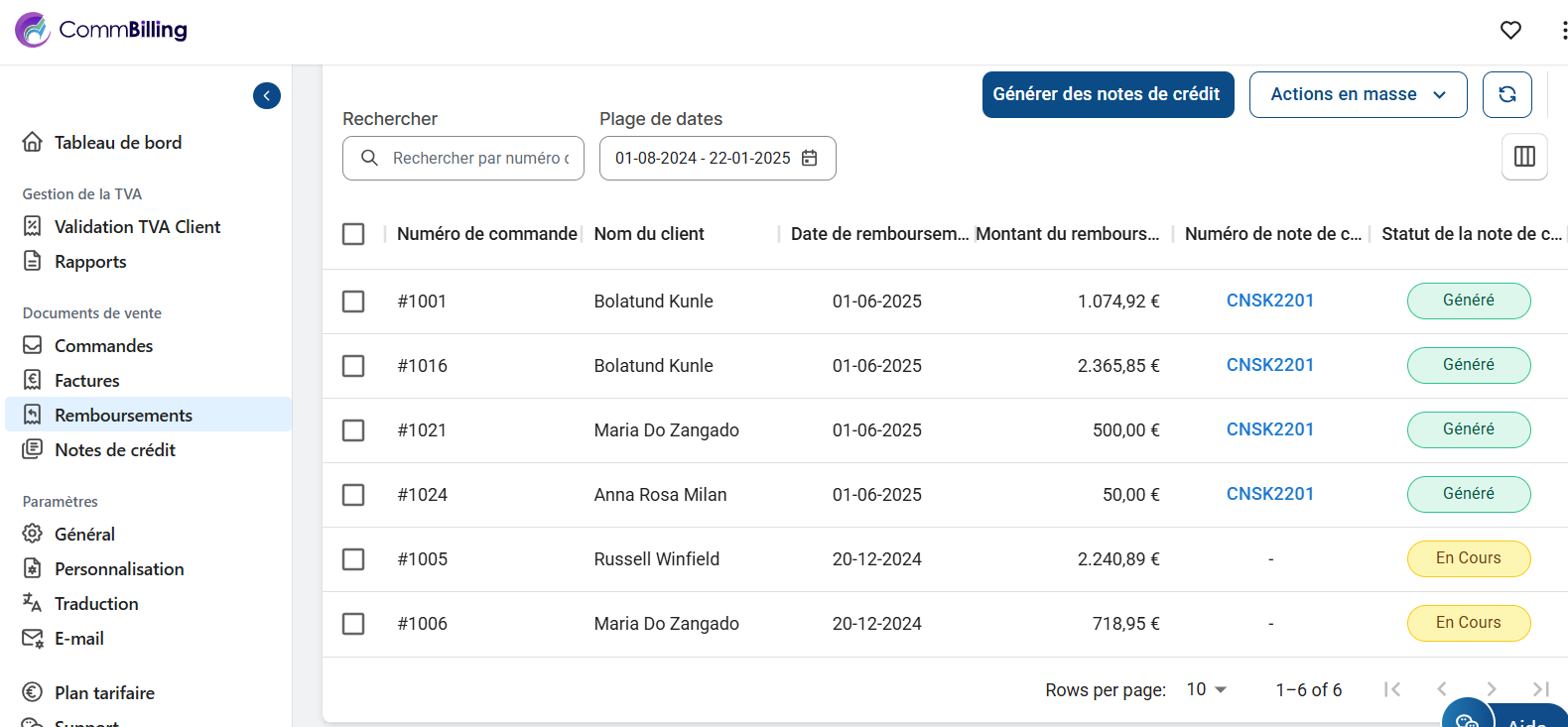Pour traiter un nouveau remboursement, cliquez sur le bouton Générer une note de crédit. Cette action crée une note de crédit associée à la facture d'origine, qui peut être envoyée au client comme preuve du remboursement. Le numéro de la note de crédit apparaîtra dans la colonne Numéro de la note de crédit une fois généré.