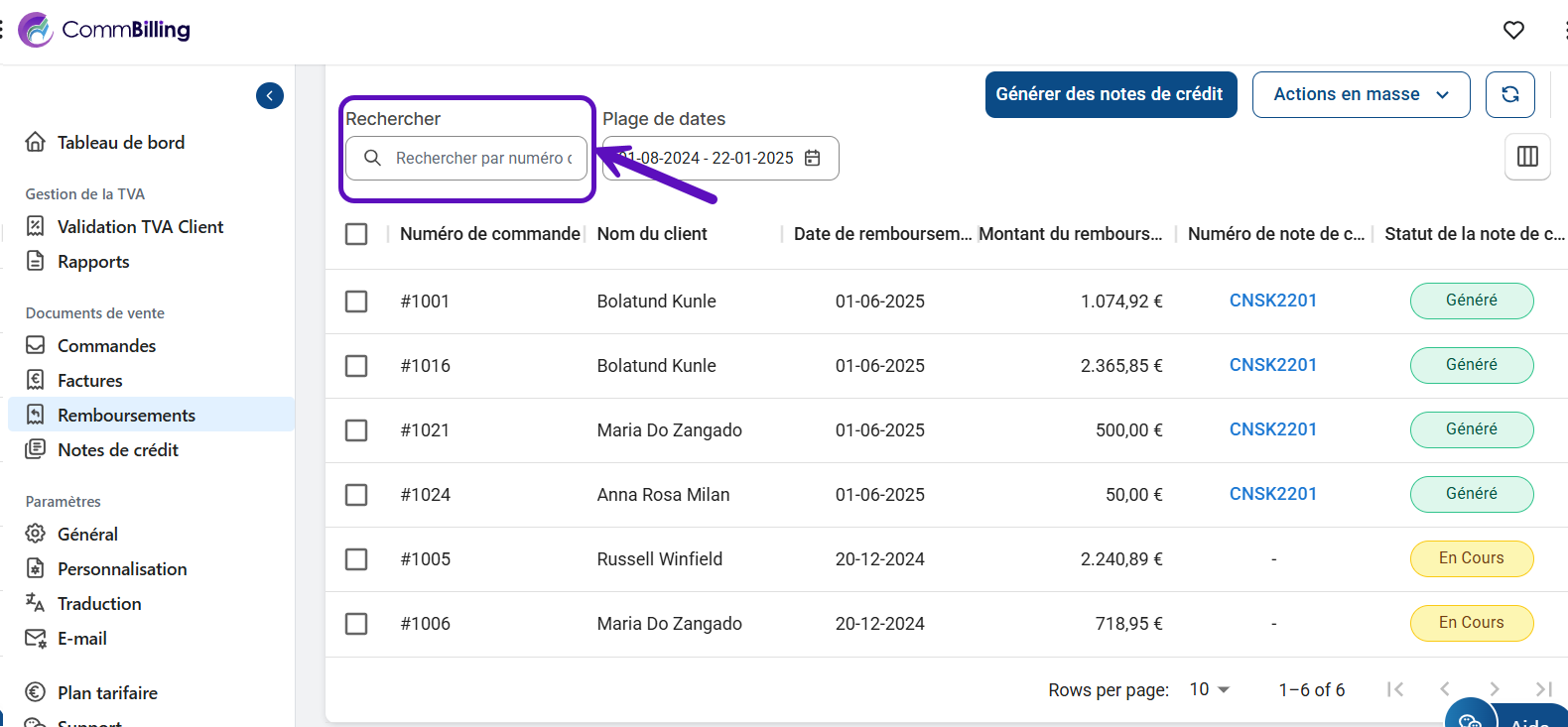 La barre de recherche en haut de l'onglet Remboursements vous permet de localiser rapidement des remboursements spécifiques en entrant des mots-clés, tels que le nom du client ou le numéro de facture. Cette fonctionnalité est particulièrement utile pour trouver des transactions précises parmi un grand volume de remboursements.