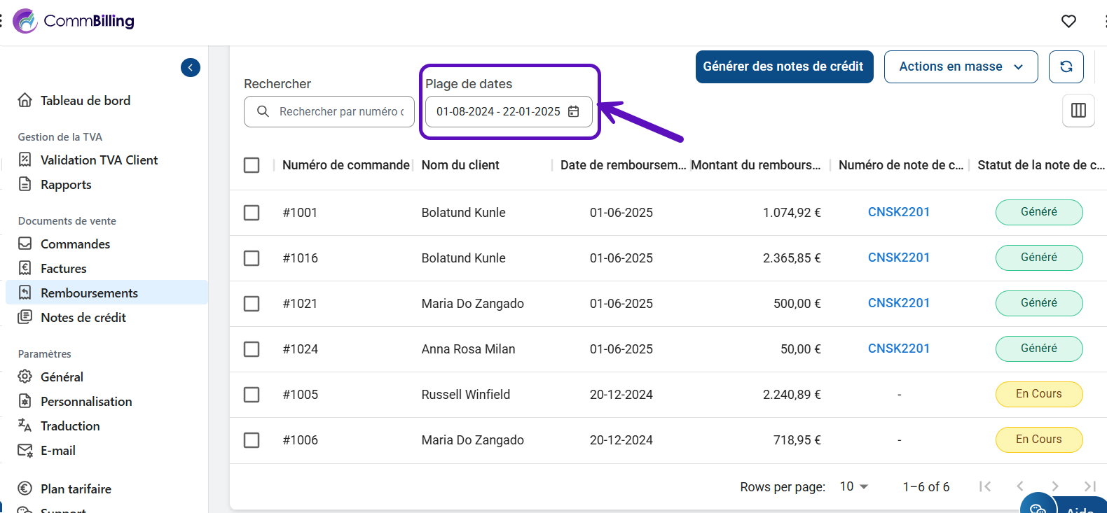 Pour afficher les remboursements dans une période particulière, utilisez le filtre de plage de dates. En sélectionnant une plage de dates spécifique, vous pouvez rapidement restreindre la liste aux remboursements émis pendant cette période. Cette fonctionnalité est utile pour les revues financières mensuelles ou trimestrielles.
