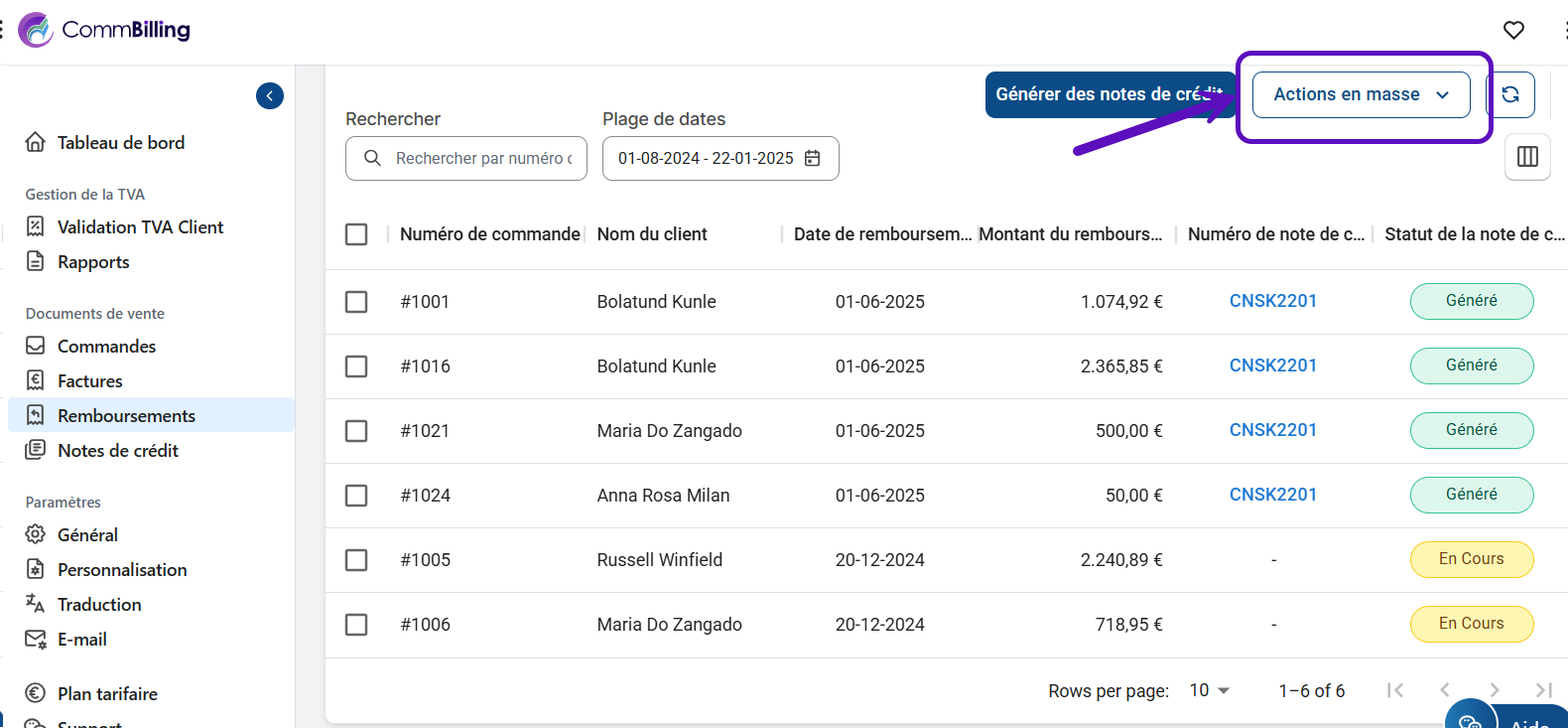 Gérer et suivre les remboursements dans CommBilling est simple grâce à l'onglet dédié Remboursements, qui offre une vue d'ensemble complète de toutes les transactions de remboursement. Cet onglet comprend des fonctionnalités utiles telles que la recherche, les filtres et les actions en masse pour rationaliser la gestion des remboursements.