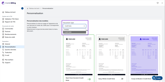 Vous pouvez modifier votre modèle d’avoir directement depuis les paramètres de personnalisation dans CommBilling. Suivez les étapes ci-dessous pour mettre à jour le design selon vos préférences.
