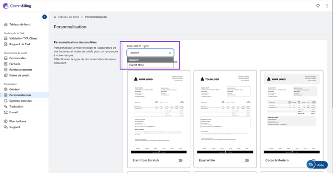 En personnalisant vos documents de vente dans CommBilling vous vous assurez que chaque facture note de crédit ou remboursement reflète le professionnalisme et l identité visuelle de votre entreprise. Cette flexibilité vous aide à fournir des documents clairs cohérents et bien conçus qui renforcent votre communication avec vos clients.