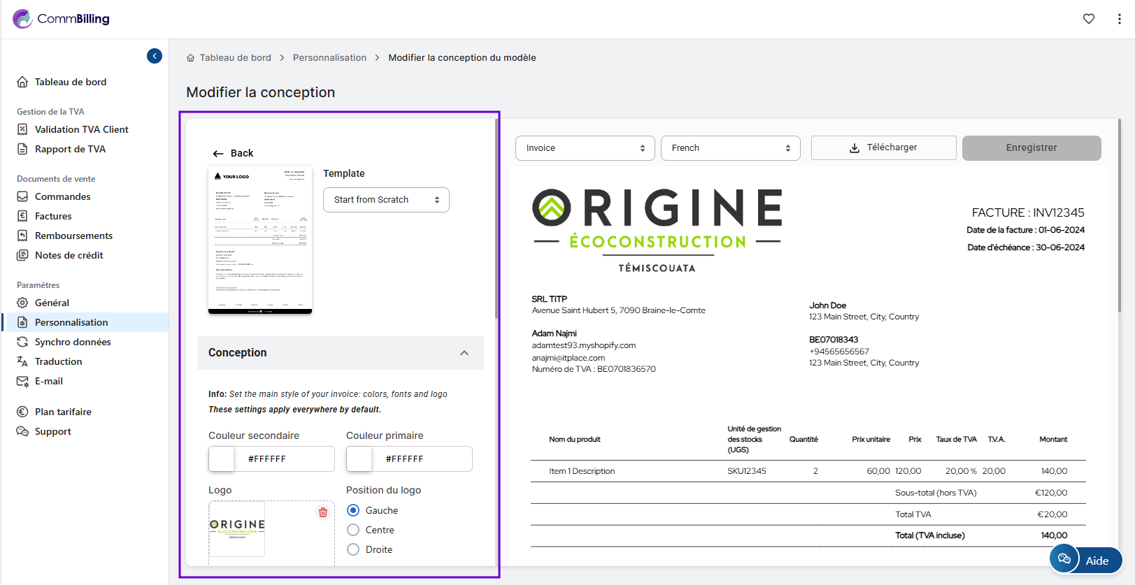 CommBilling offre des options de design flexibles afin que vous puissiez ajuster les couleurs les polices les champs et les éléments de marque pour garantir que chaque document que vous envoyez soit professionnel et aligné avec votre identité visuelle.