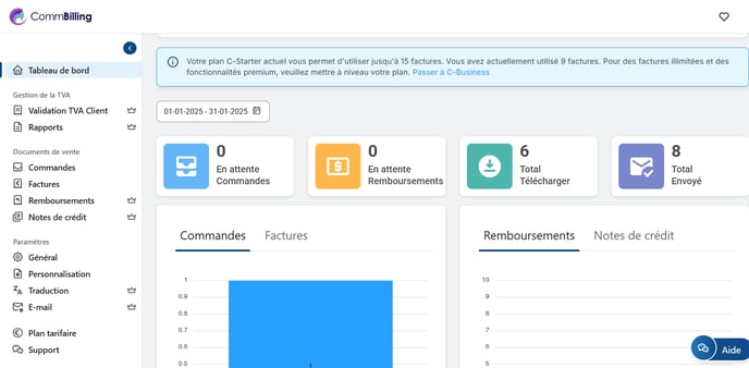 CommBilling vous permet de surveiller le nombre de factures générées au cours du mois en cours directement depuis le tableau de bord.