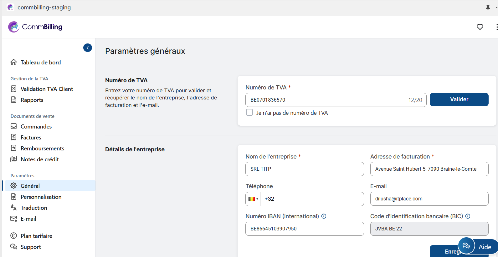 - Numéro de TVA : Entrez le numéro de TVA de votre entreprise pour la conformité fiscale et appuyez sur le bouton Valider.