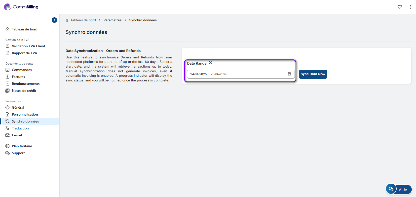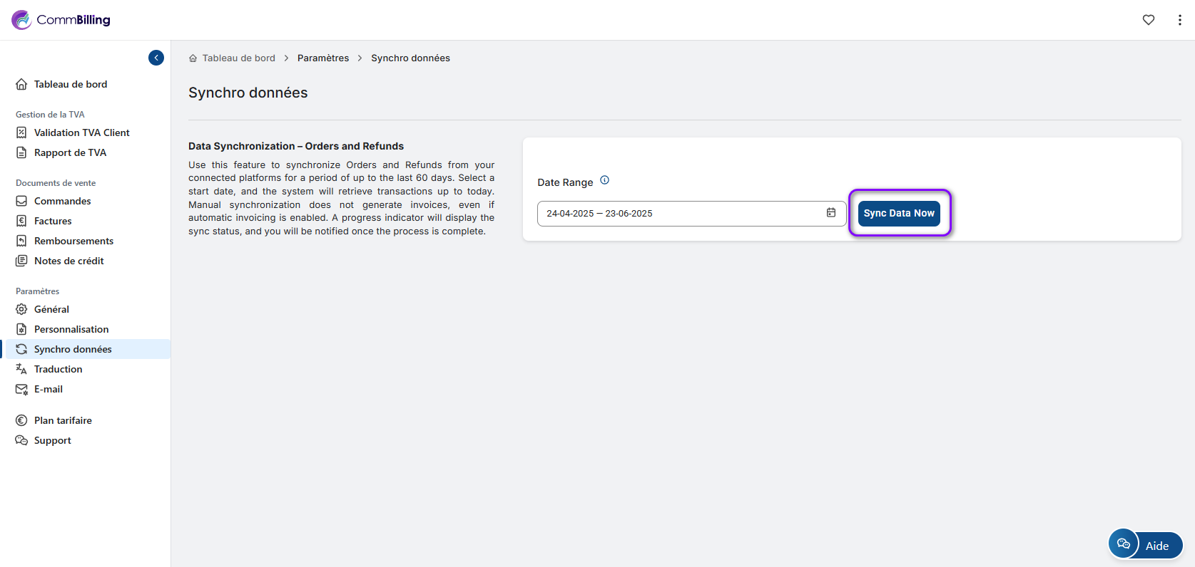 Cette fonction est particulièrement utile lors de l'intégration, lors du test de votre configuration de facturation, ou en cas de retards d'intégration. Elle est conçue pour garantir que vos données historiques, jusqu'à 60 jours en arrière, sont entièrement alignées, sans avoir à attendre le prochain cycle de synchronisation automatique.