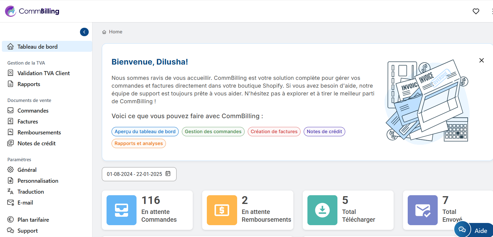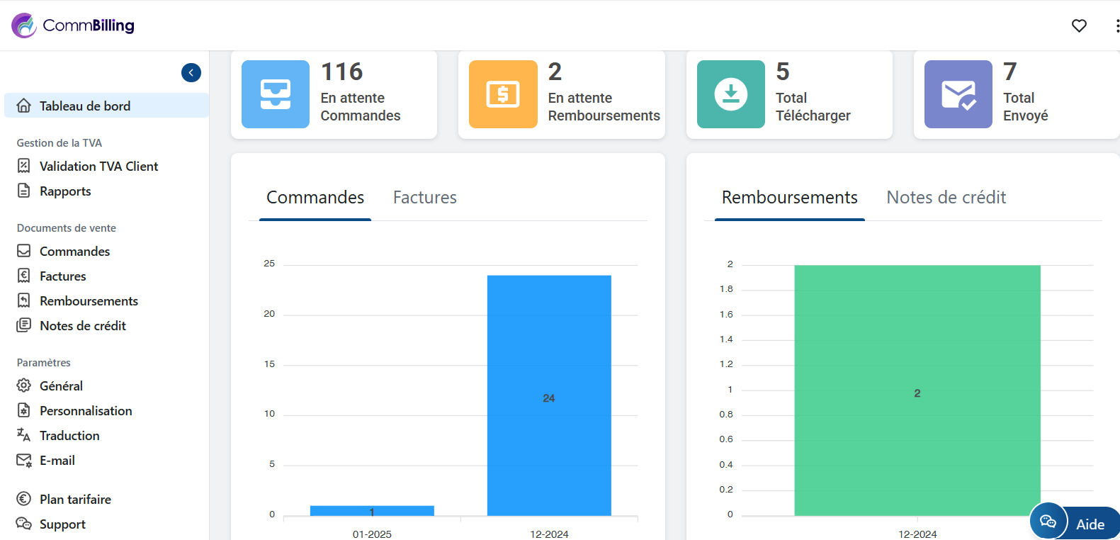 CommBilling offre un tableau de bord avec des indicateurs clés et des représentations graphiques de l'activité de votre entreprise, vous fournissant des informations rapides sur les commandes, les factures, les remboursements et les notes de crédit.