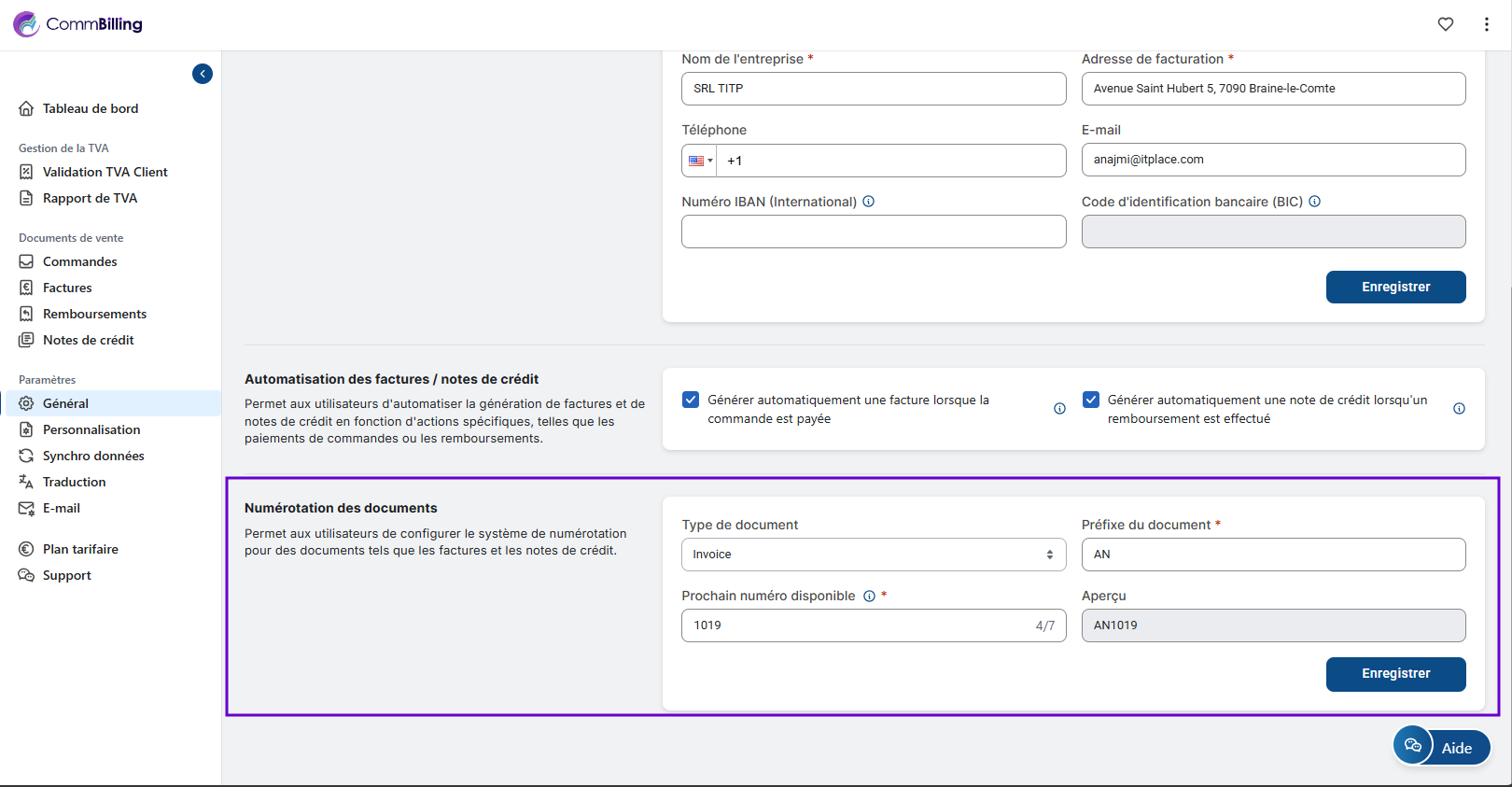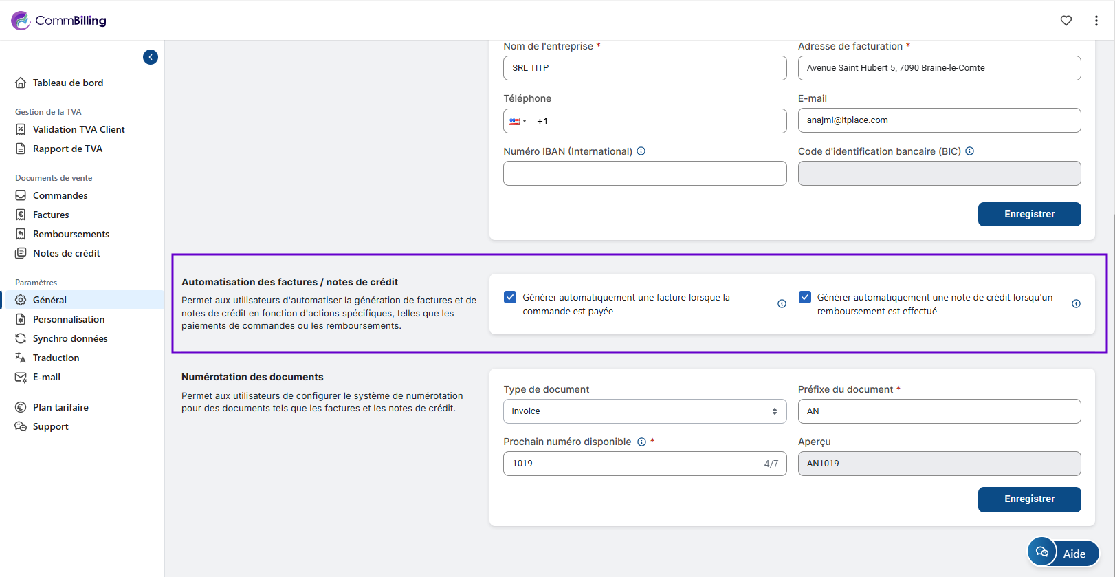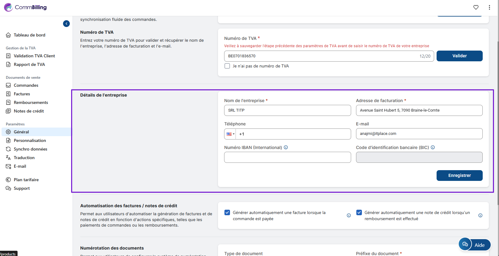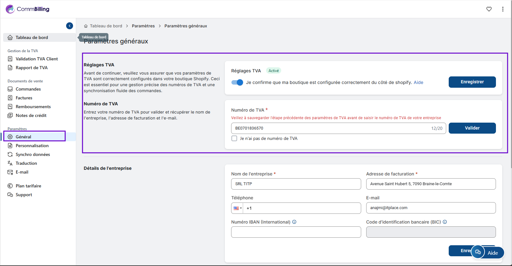Configurer vos paramètres généraux est une étape essentielle pour garantir conformité, précision et efficacité opérationnelle. Une fois cette configuration terminée, CommBilling peut synchroniser correctement vos commandes, valider les informations TVA et appliquer des données cohérentes à tous les documents de vente. Cette base assure une expérience de facturation fluide et professionnelle dès le départ.