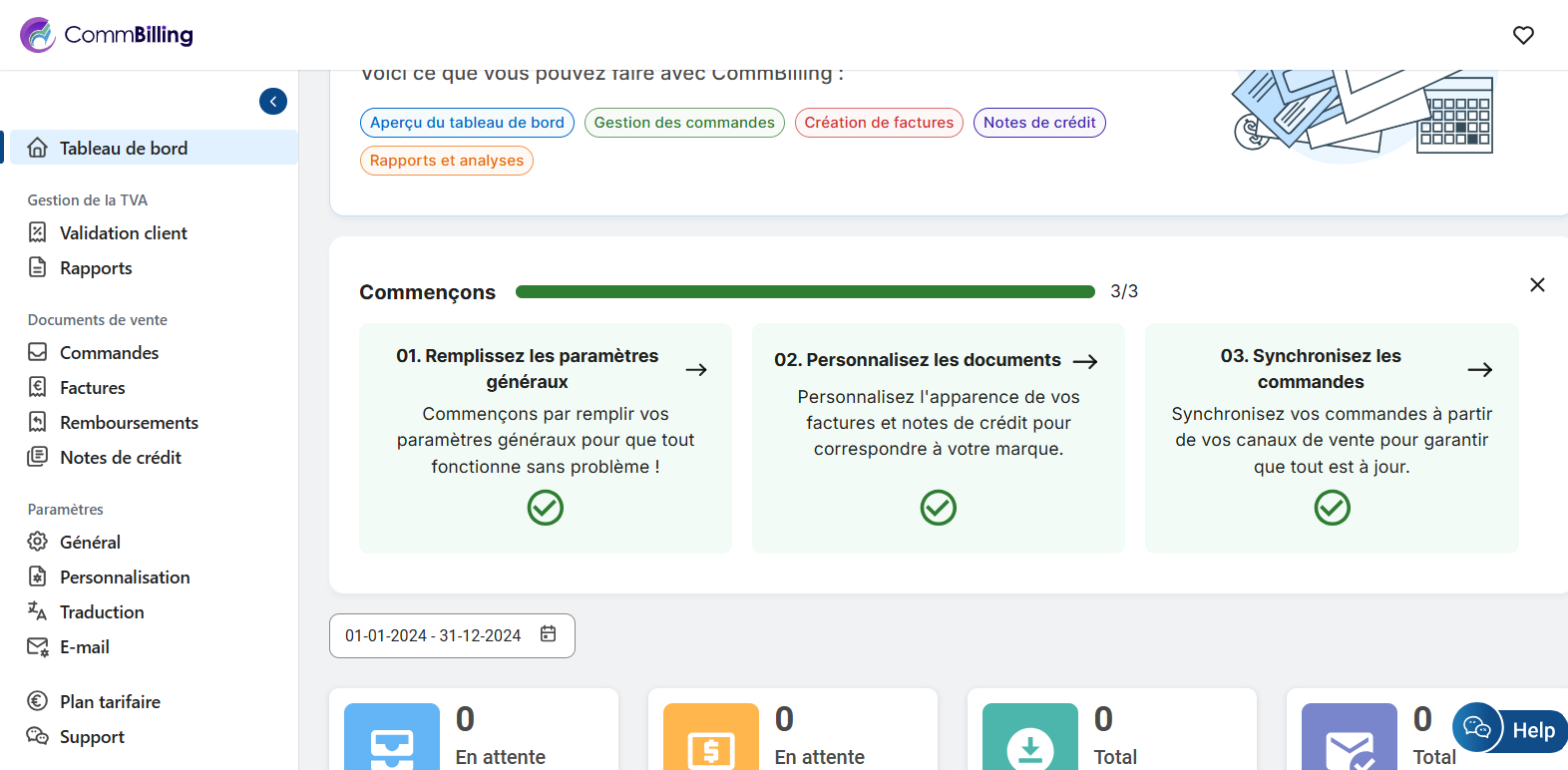 Pour les nouveaux utilisateurs, la section "Commençons" décrit trois étapes simples pour commencer à utiliser CommBilling :
