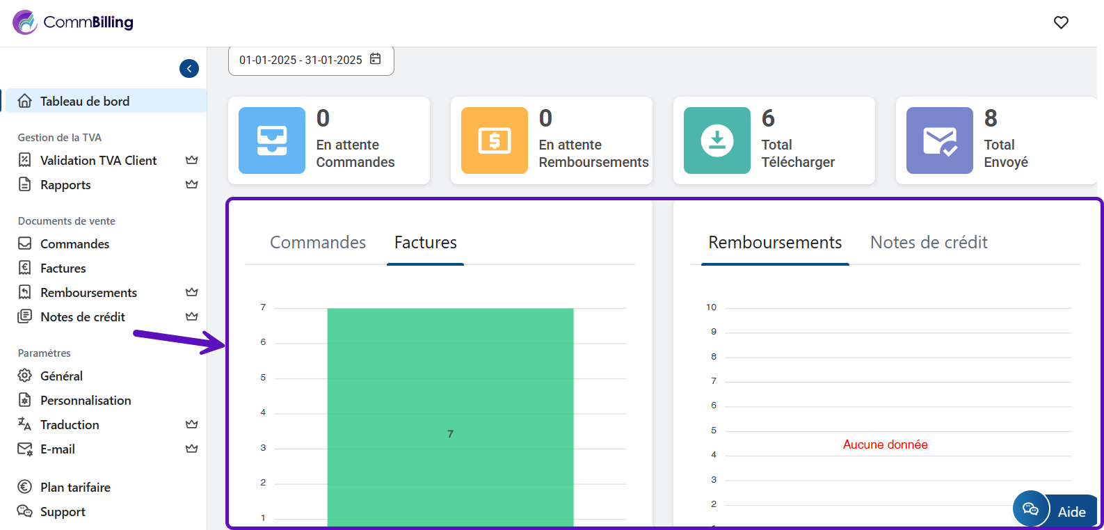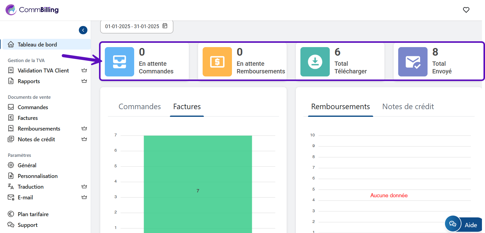 - Consultez le nombre de documents téléchargés, tels que les factures et les notes de crédit, pour la tenue des dossiers.