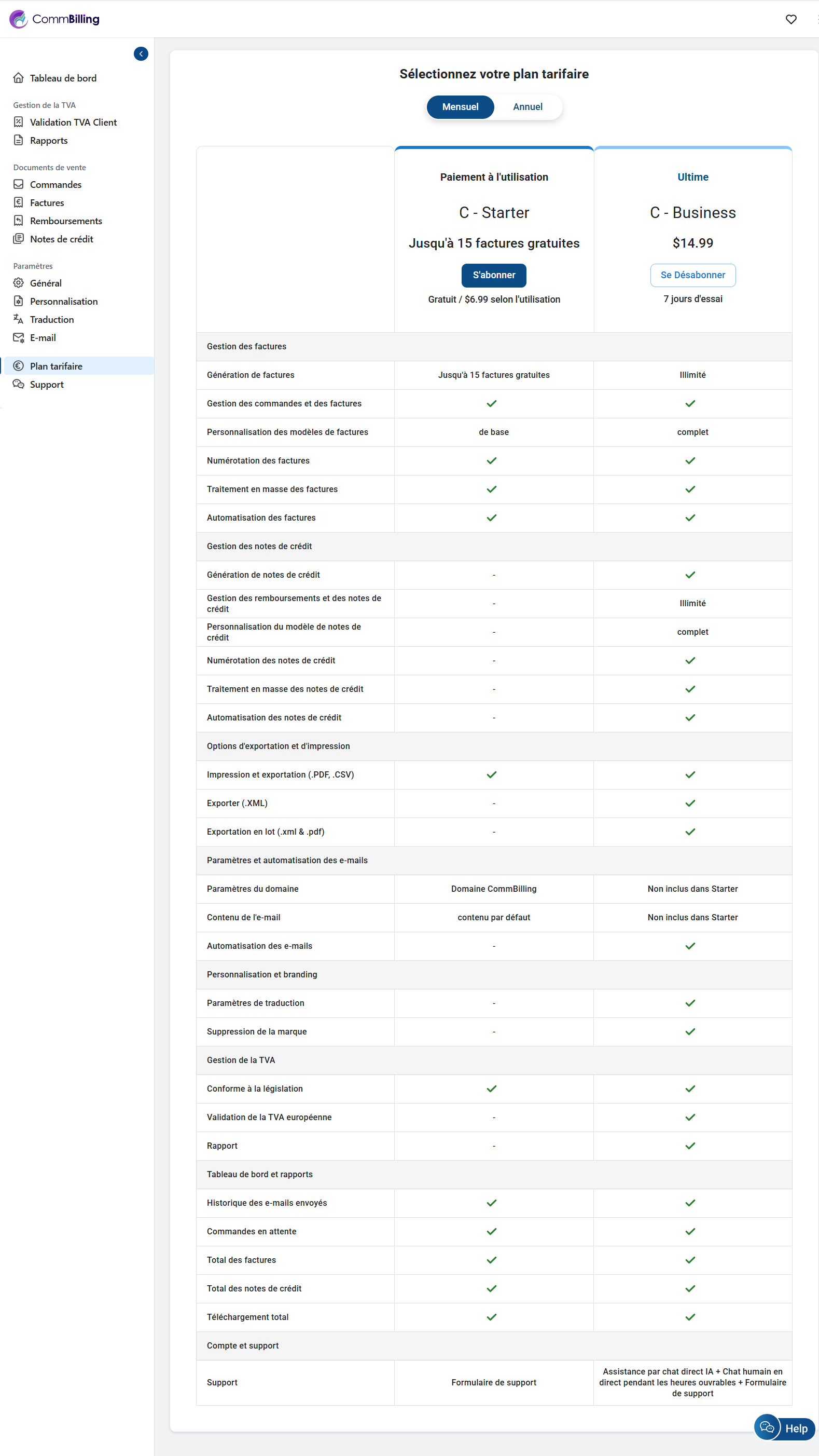 Plan d'abonnement C-Business de CommBilling
