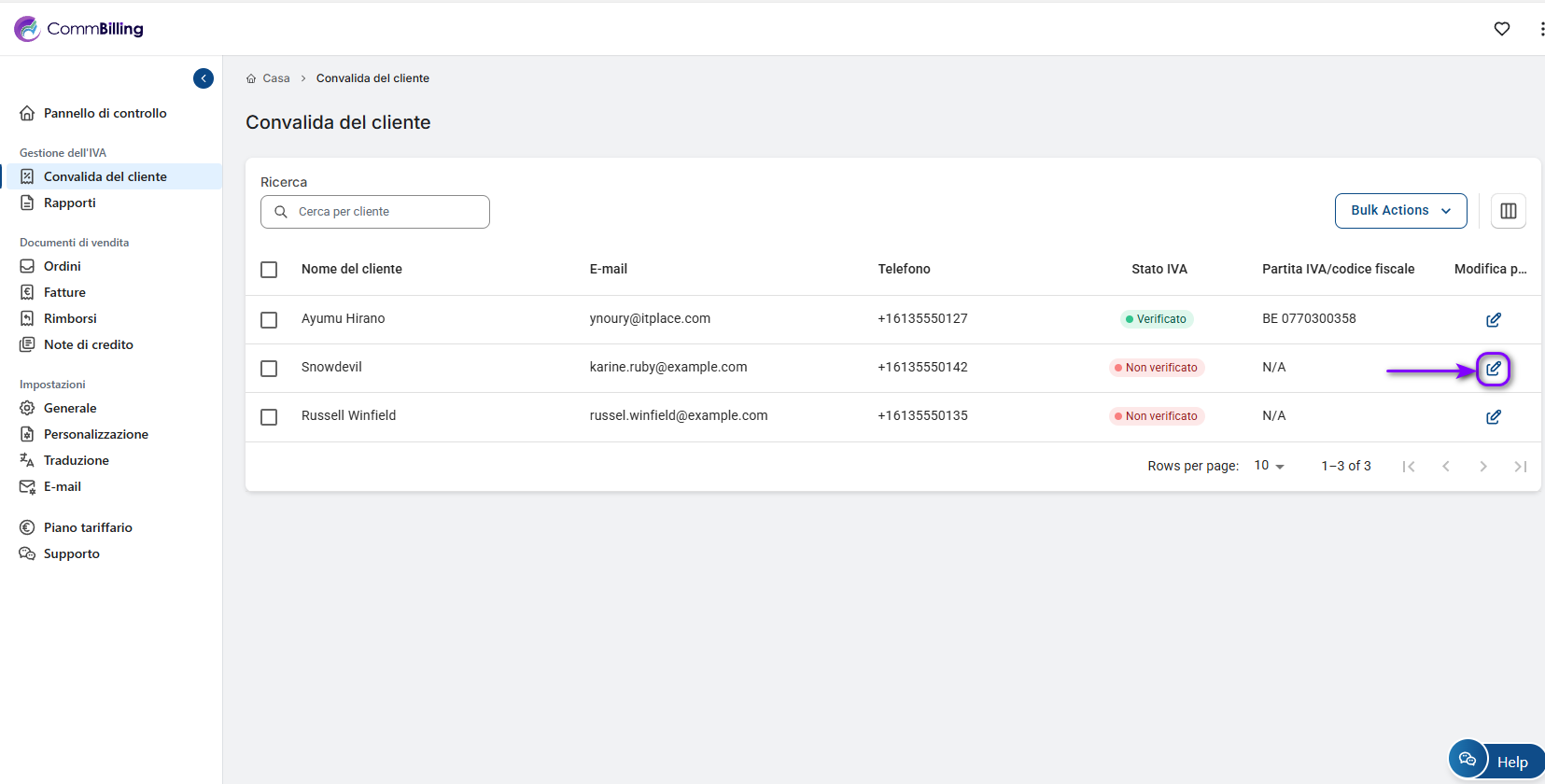 2. Individuare il cliente per il quale si desidera aggiungere o convalidare il numero di partita IVA. Fare clic sulla matita (icona di modifica) accanto al campo IVA del cliente.