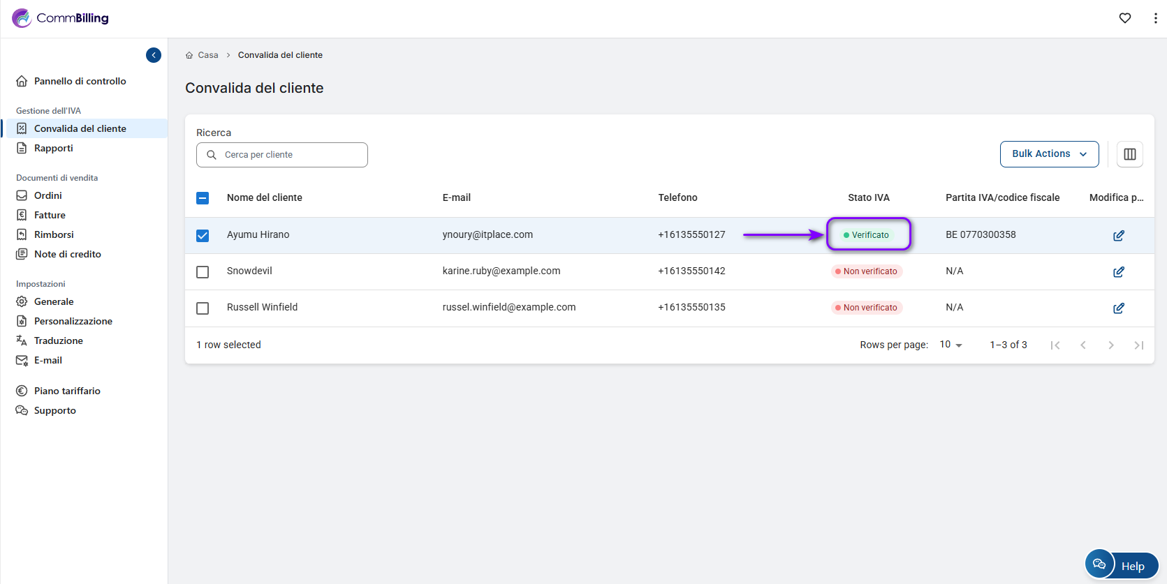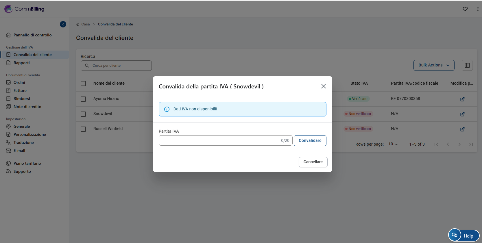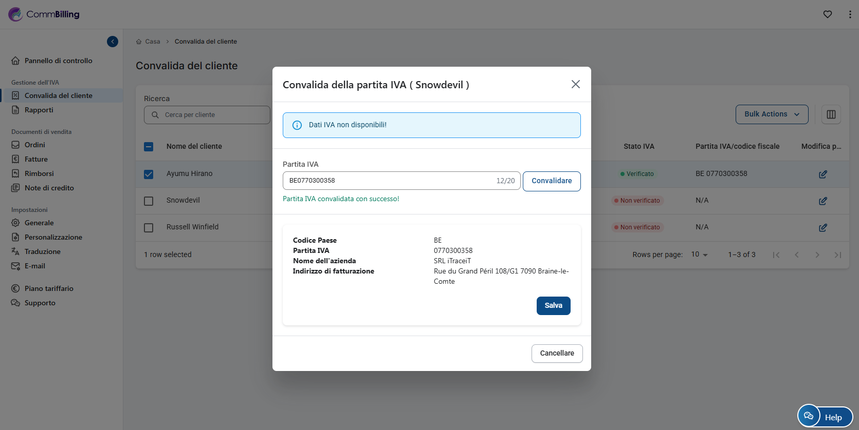 2. Fare clic sul pulsante Convalida. CommBilling controllerà e convaliderà automaticamente il numero di partita IVA con il sistema IVA europeo.