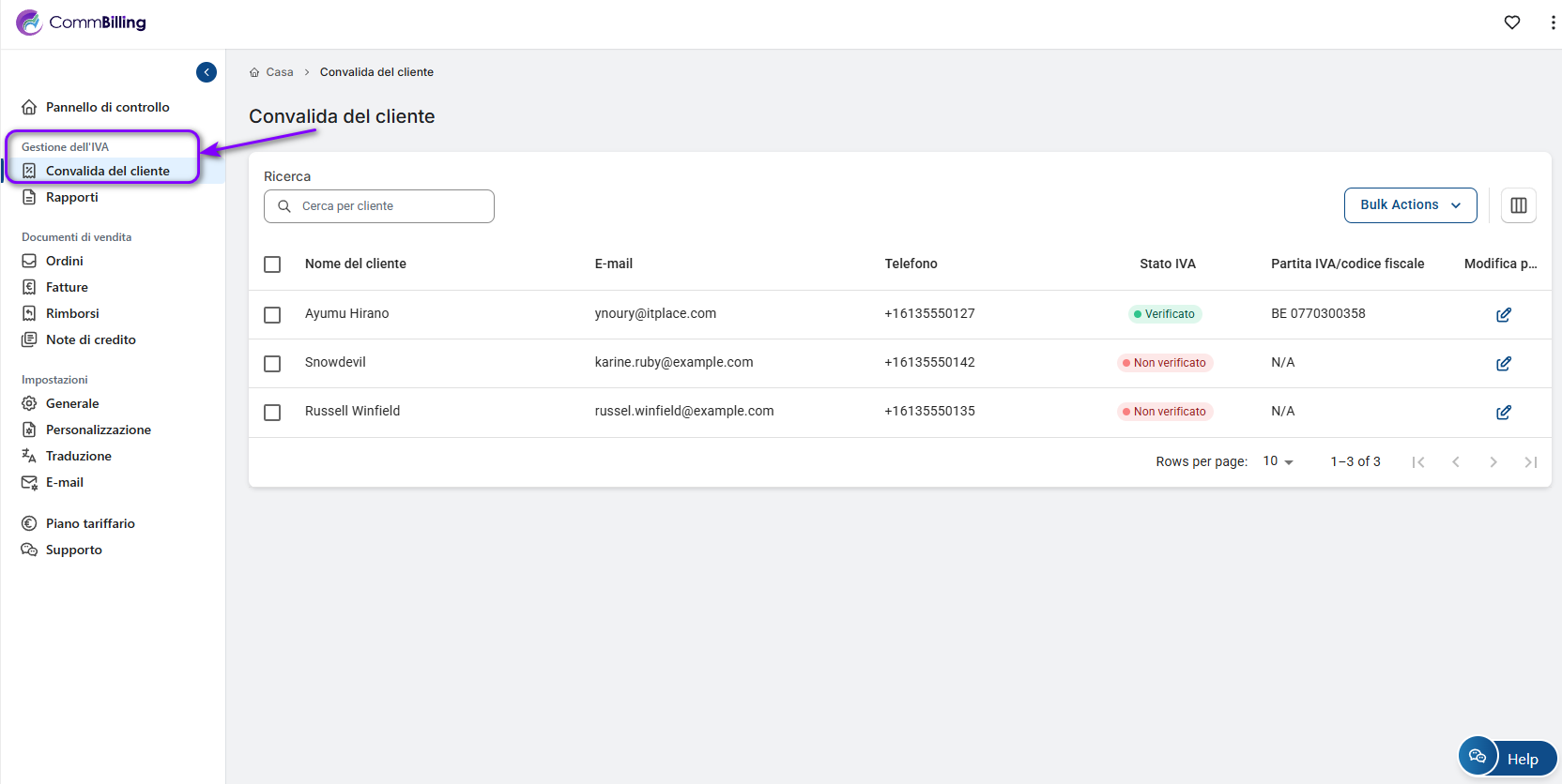 La convalida dei numeri di partita IVA europei dei vostri clienti è essenziale per garantire la conformità alle normative fiscali. Seguite questi passaggi per aggiungere e convalidare il numero di partita IVA di un cliente utilizzando la funzione Gestione IVA di CommBilling: