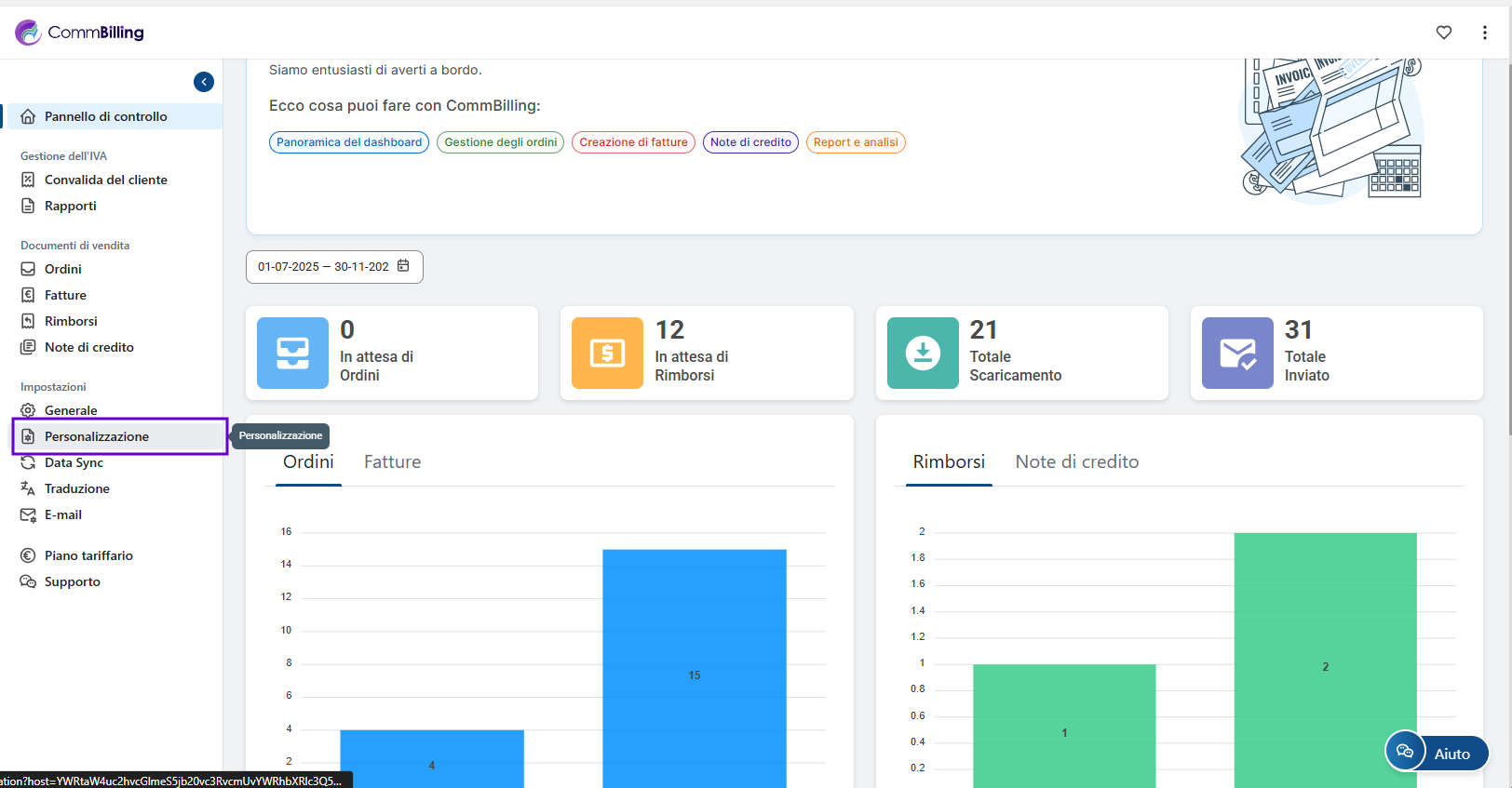 - Passaggio 1: Vai alla sezione Impostazioni in CommBilling e seleziona la scheda Personalizzazione dal menu.
