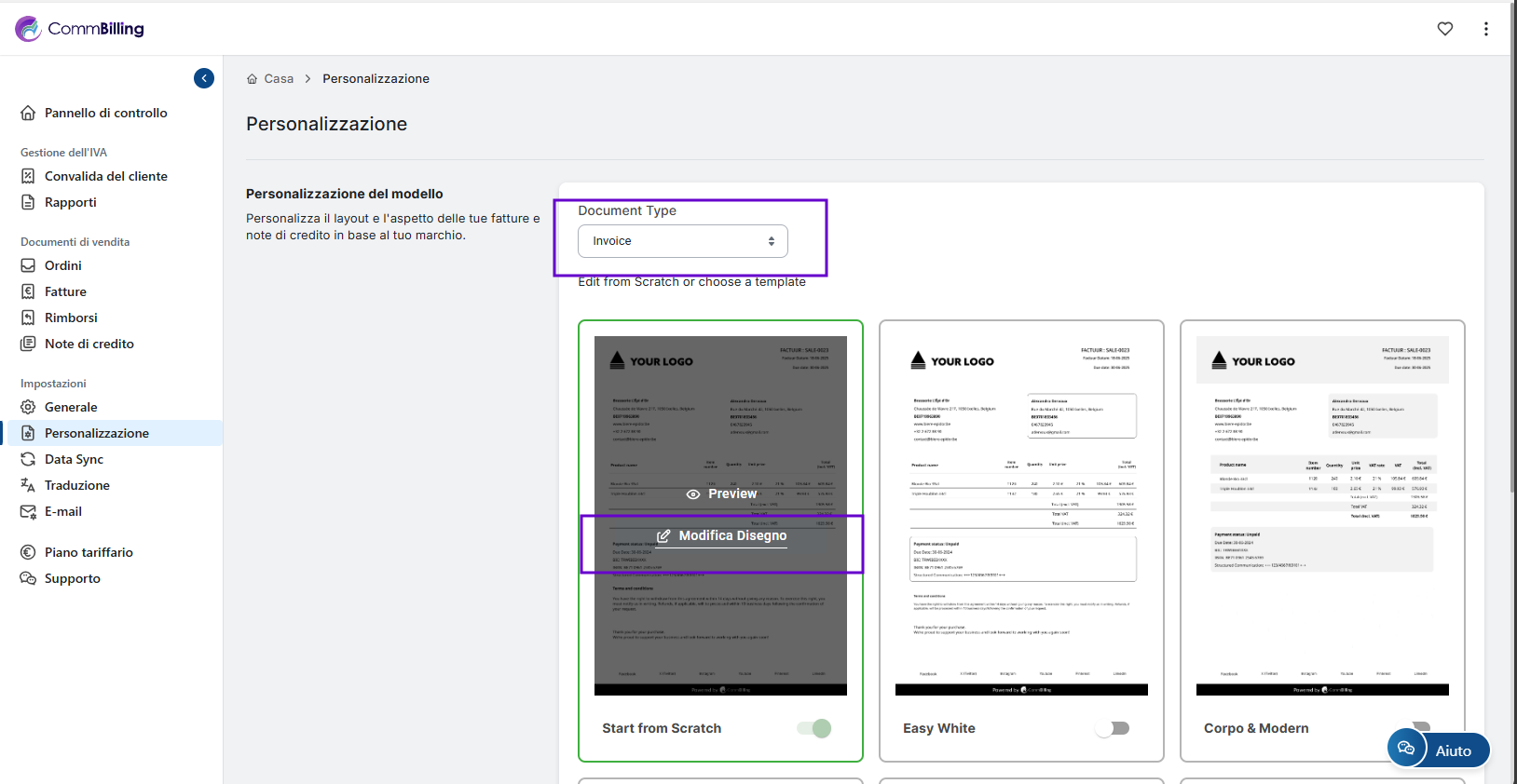 - Passaggio 2: Assicurati di essere su Fattura nel tipo di documento quindi posiziona il mouse sul modello desiderato e fai clic su Modifica design.