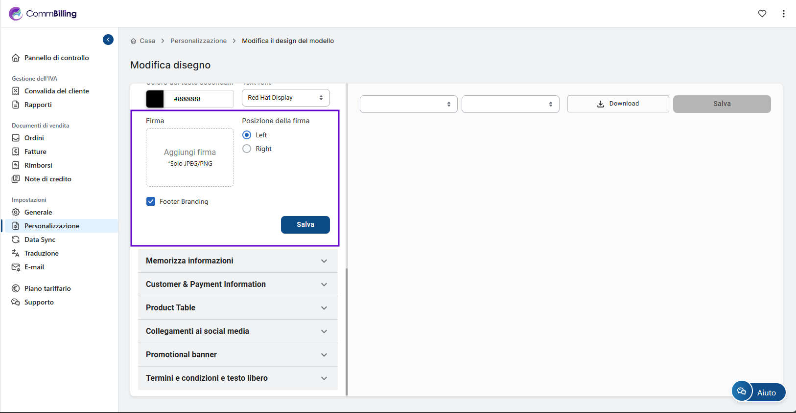 Nota: Questa funzione è disponibile solo per gli utenti del piano C-Business. La firma digitale non è supportata. È possibile aggiungere alla fattura solo un’immagine caricata della propria firma.