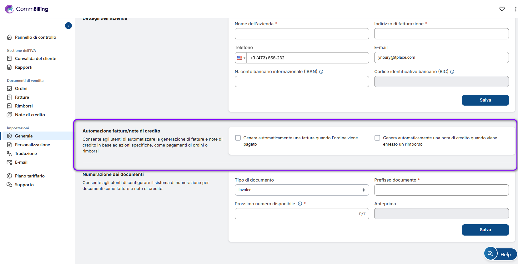 - Fase 1: accedere alla scheda Impostazioni di CommBilling.