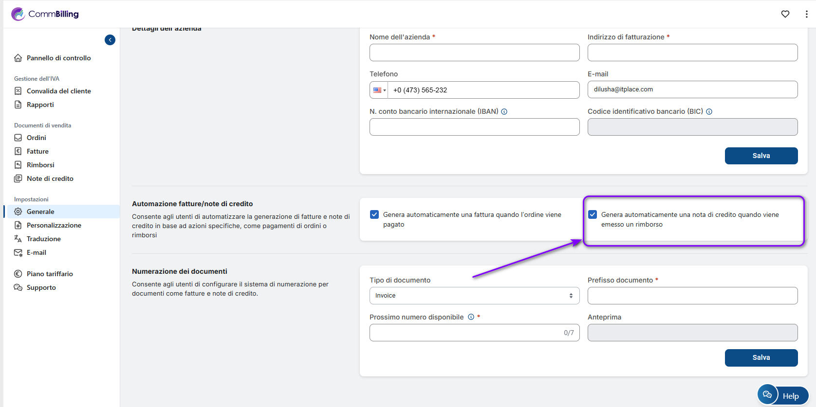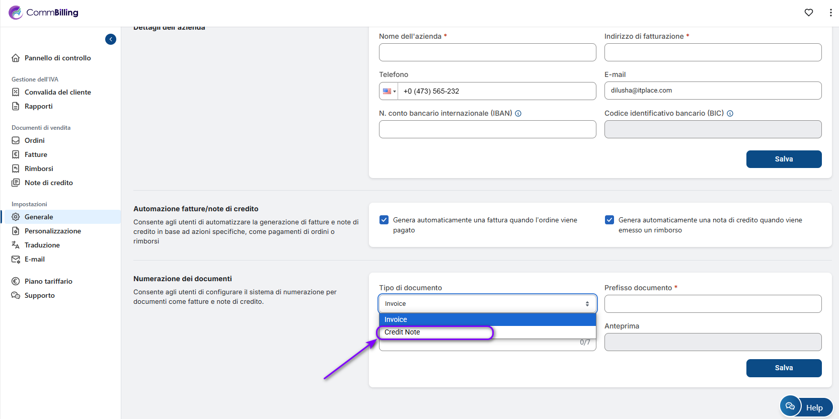 - Accedere alle impostazioni generali di CommBilling, sezione “Automazione fatture / note di credito”.
