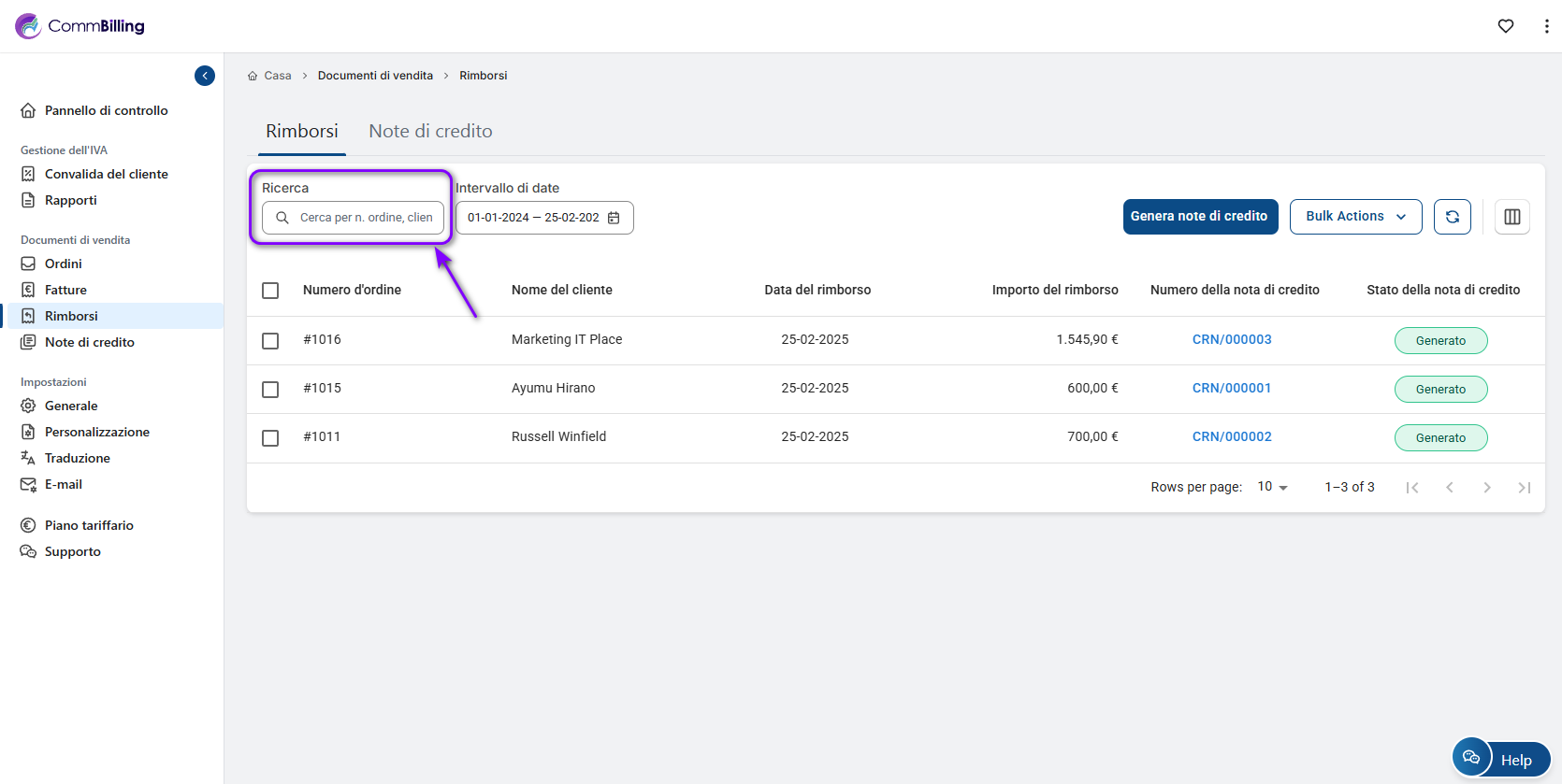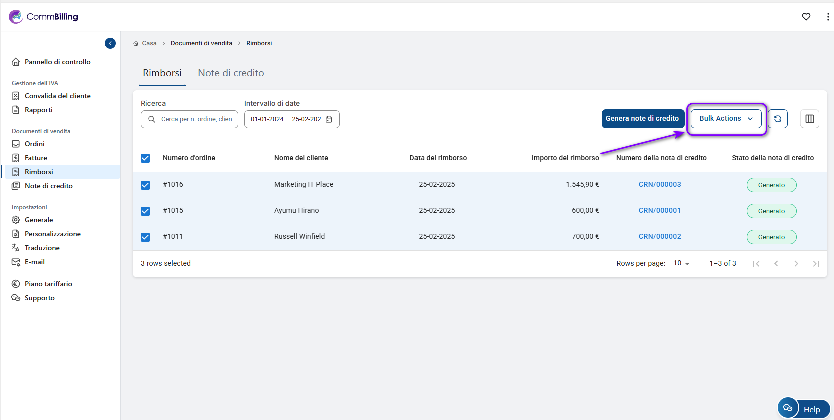La gestione e il monitoraggio dei rimborsi in CommBilling sono semplici, grazie a una scheda dedicata ai rimborsi che fornisce una panoramica completa di tutte le transazioni di rimborso. Questa scheda include funzioni utili come la ricerca, i filtri e le azioni in blocco per semplificare la gestione dei rimborsi.