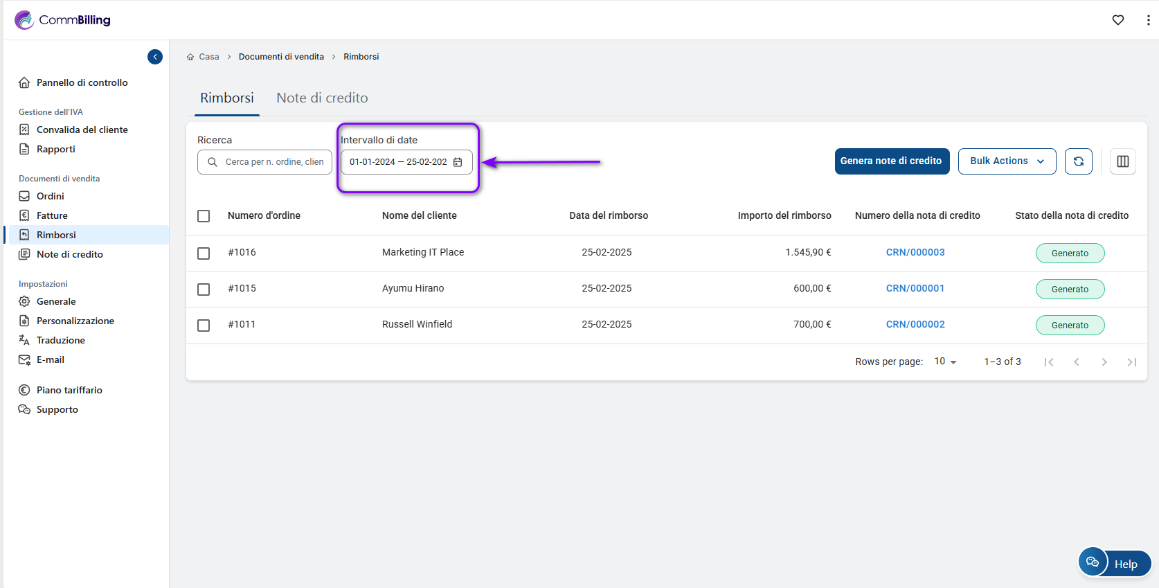 Per visualizzare i rimborsi in un determinato periodo di tempo, utilizzare il filtro per intervallo di date. Selezionando un intervallo di date specifico, è possibile restringere rapidamente l'elenco ai rimborsi emessi in quel periodo. Questa funzione è utile per le revisioni finanziarie mensili o trimestrali.
