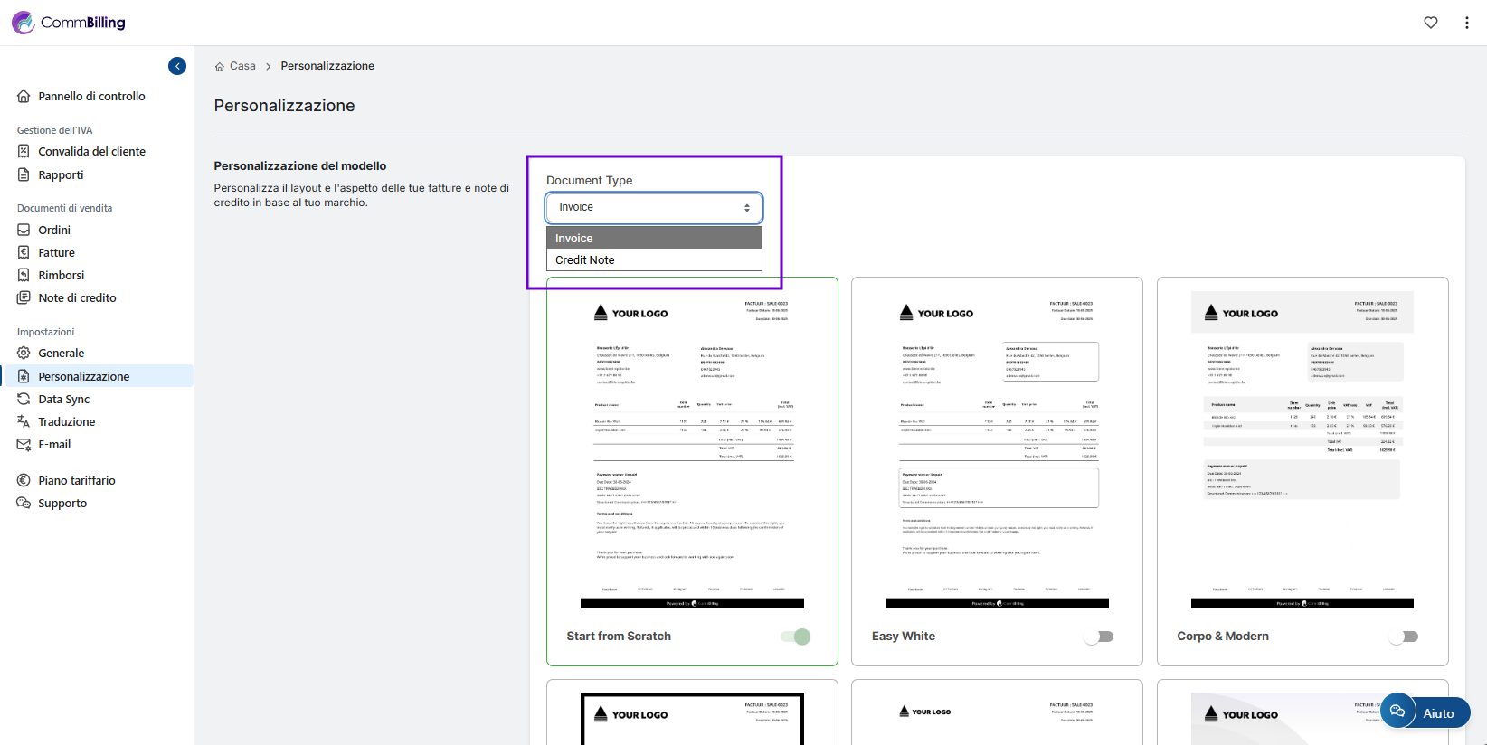 - Passo 2: In Tipo di documento, scegli il modello di fattura.