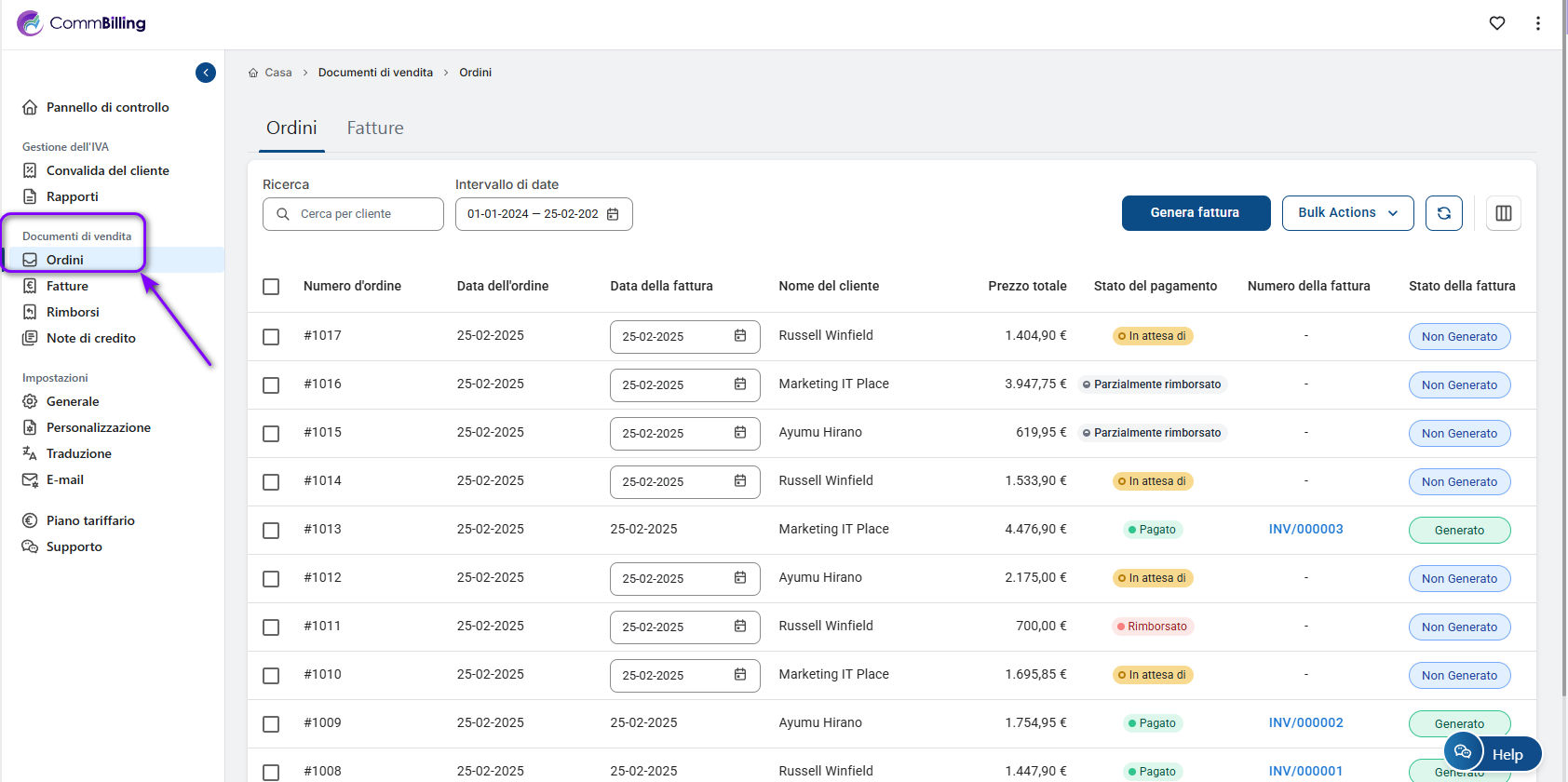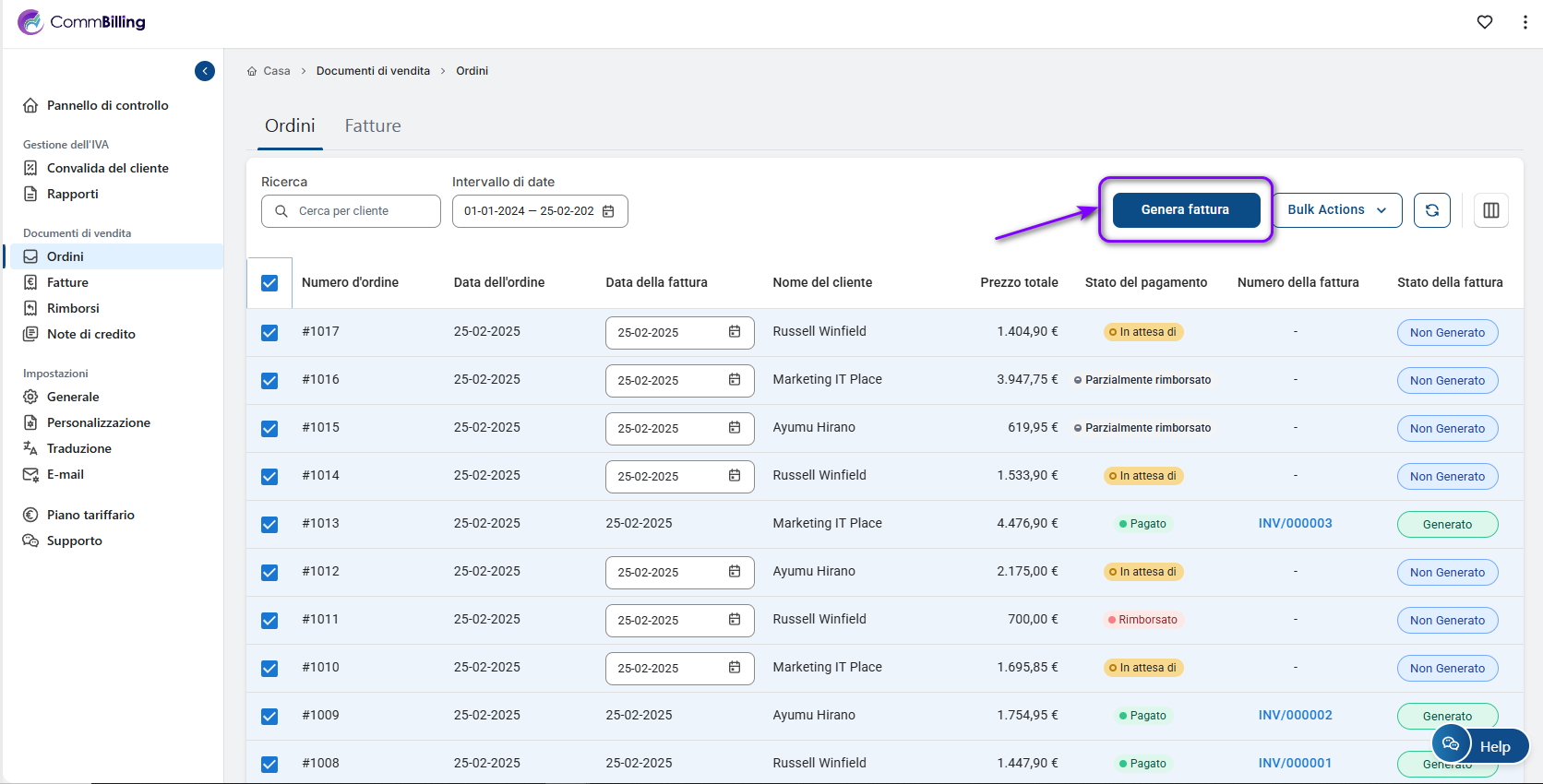 Dopo aver fatto clic sul pulsante "Genera fattura", il sistema elaborerà la richiesta. Una volta che la fattura è stata generata con successo, la colonna di stato accanto all'ordine cambierà in "Generato."