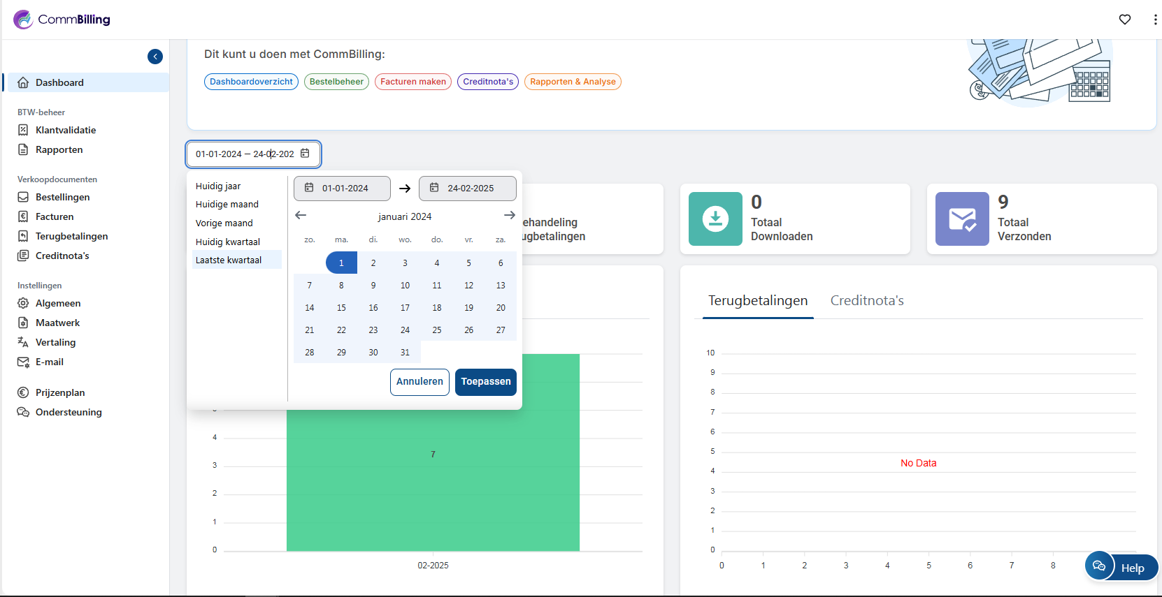 Tracciare il numero di fatture generate nel mese corrente è facile e veloce grazie al dashboard e agli strumenti di filtraggio di CommBilling. Seguendo questi passaggi, è possibile tenere sotto controllo l'attività di fatturazione e gestire le fatture in modo efficace.