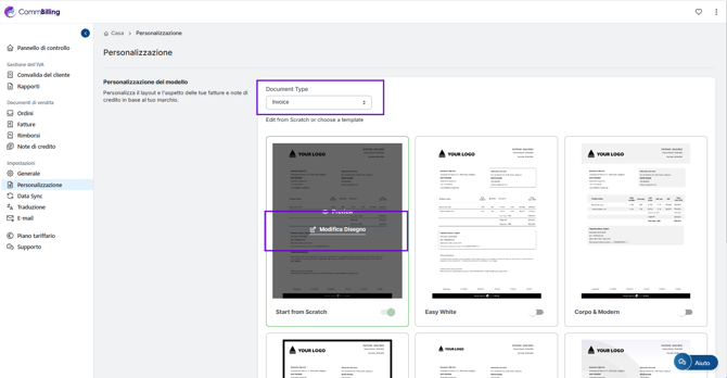 La personalizzazione delle tue fatture ti permette di creare documenti che riflettono completamente l identità e la professionalità della tua azienda. Con CommBilling puoi personalizzare ogni aspetto visivo delle tue fatture dai colori e dai caratteri fino al posizionamento del logo e ai campi visualizzati e garantire che ogni documento inviato sia in linea con la tua marca e con i tuoi standard di comunicazione.