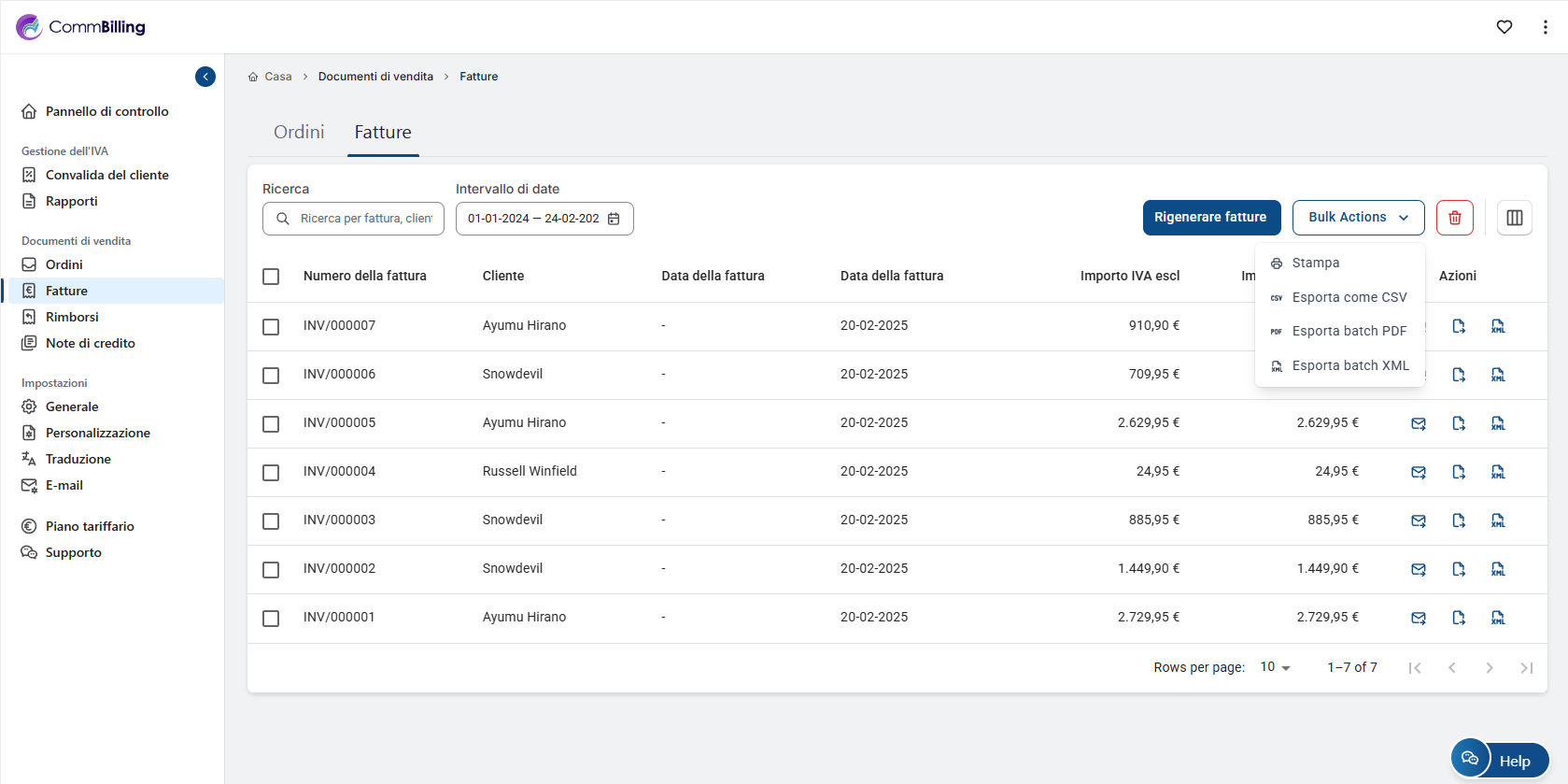L'elaborazione delle fatture in blocco in CommBilling semplifica il flusso di lavoro, consentendo di gestire più fatture contemporaneamente. Questa funzione è ideale per le aziende che gestiscono elevati volumi di transazioni, in quanto rende più facile aggiornare, esportare o rivedere le fatture in grandi lotti, risparmiando tempo e fatica.