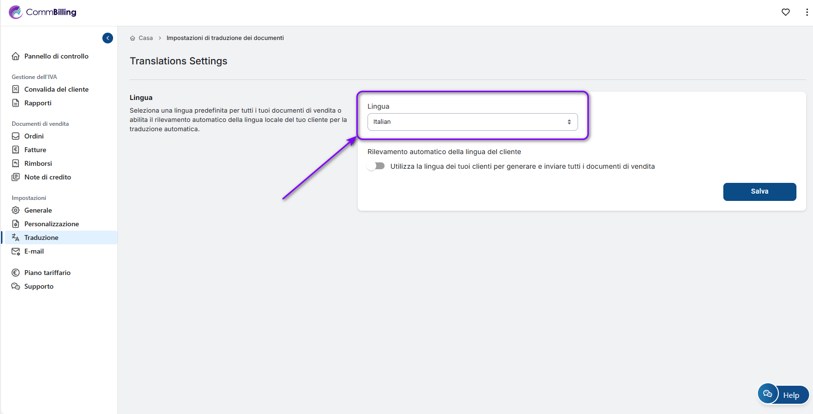 CommBilling consente di personalizzare i documenti di vendita e e-mail impostando le preferenze di traduzione. Questa funzione è particolarmente utile per le imprese che operano in più lingue o regioni. Seguire questi passaggi per configurare le impostazioni di traduzione: