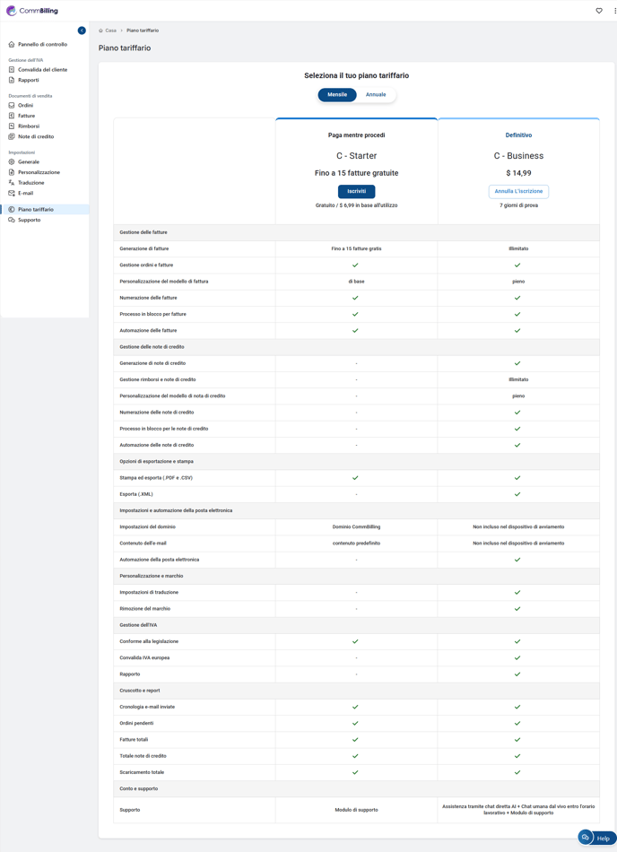 Il piano C-Business di CommBilling è progettato per i negozi Shopify che richiedono strumenti di fatturazione più avanzati, una maggiore personalizzazione e la flessibilità necessaria per gestire grandi volumi di transazioni.